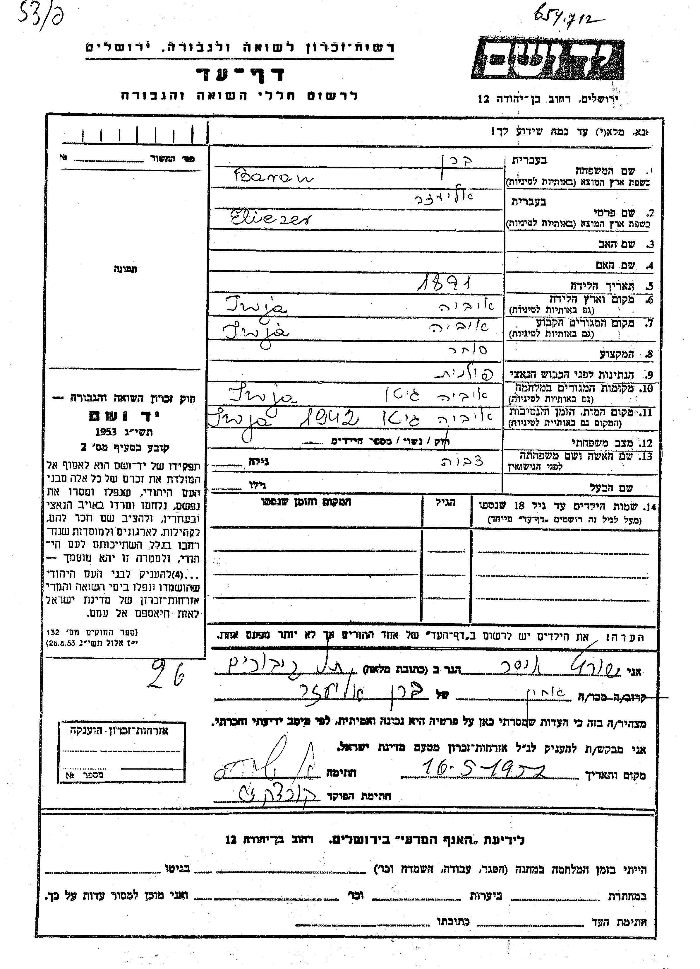 אליעזר נרצח בשואה. מקום המוות: Ivia שבפולין בשנת 1942.