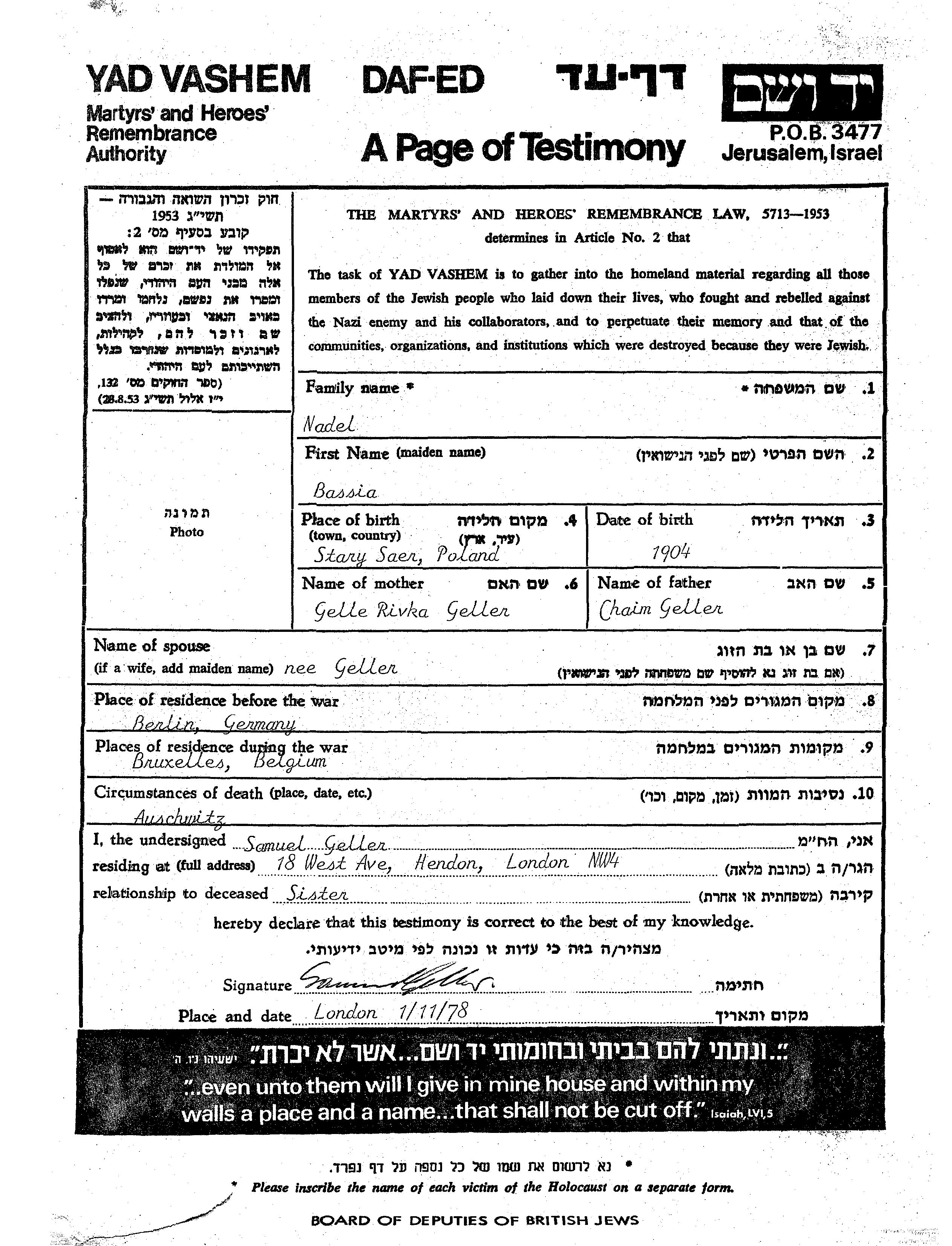 Bassia נדל לבית Geller נולדה בStary Sacz שבפולין בשנת 1904 לחיים ורבקה. לפני מלחמת העולם השניה התגוררה בBerlin שבגרמניה. בזמן המלחמה היא היתה בBruxelles שבבלגיה.