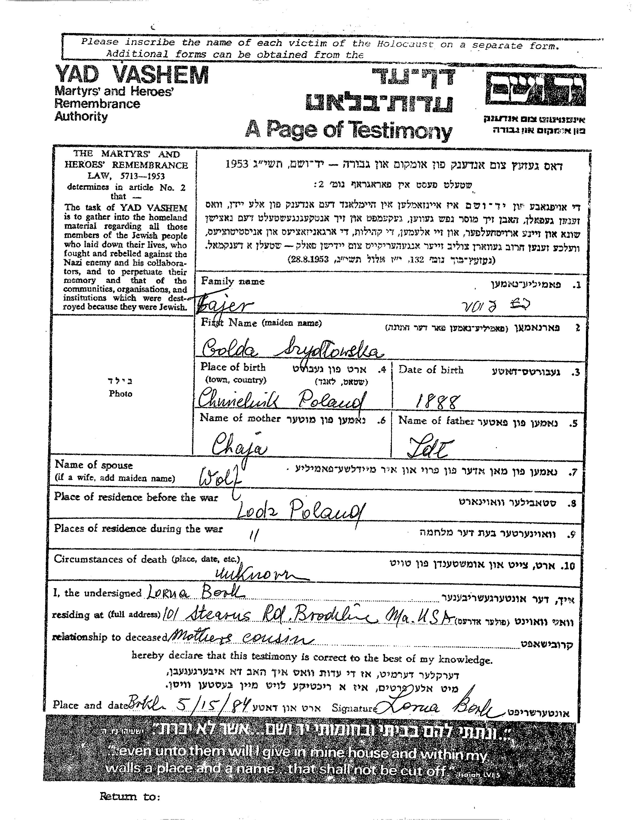 גולדה Fajer לבית Frydlowska נולדה בChmelnik שבפולין בשנת 1888 לYdl וChaja. היא היתה נשואה לWolf. לפני מלחמת העולם השניה התגוררה בLodz שבפולין. בזמן המלחמה היא היתה בLodz שבפולין.