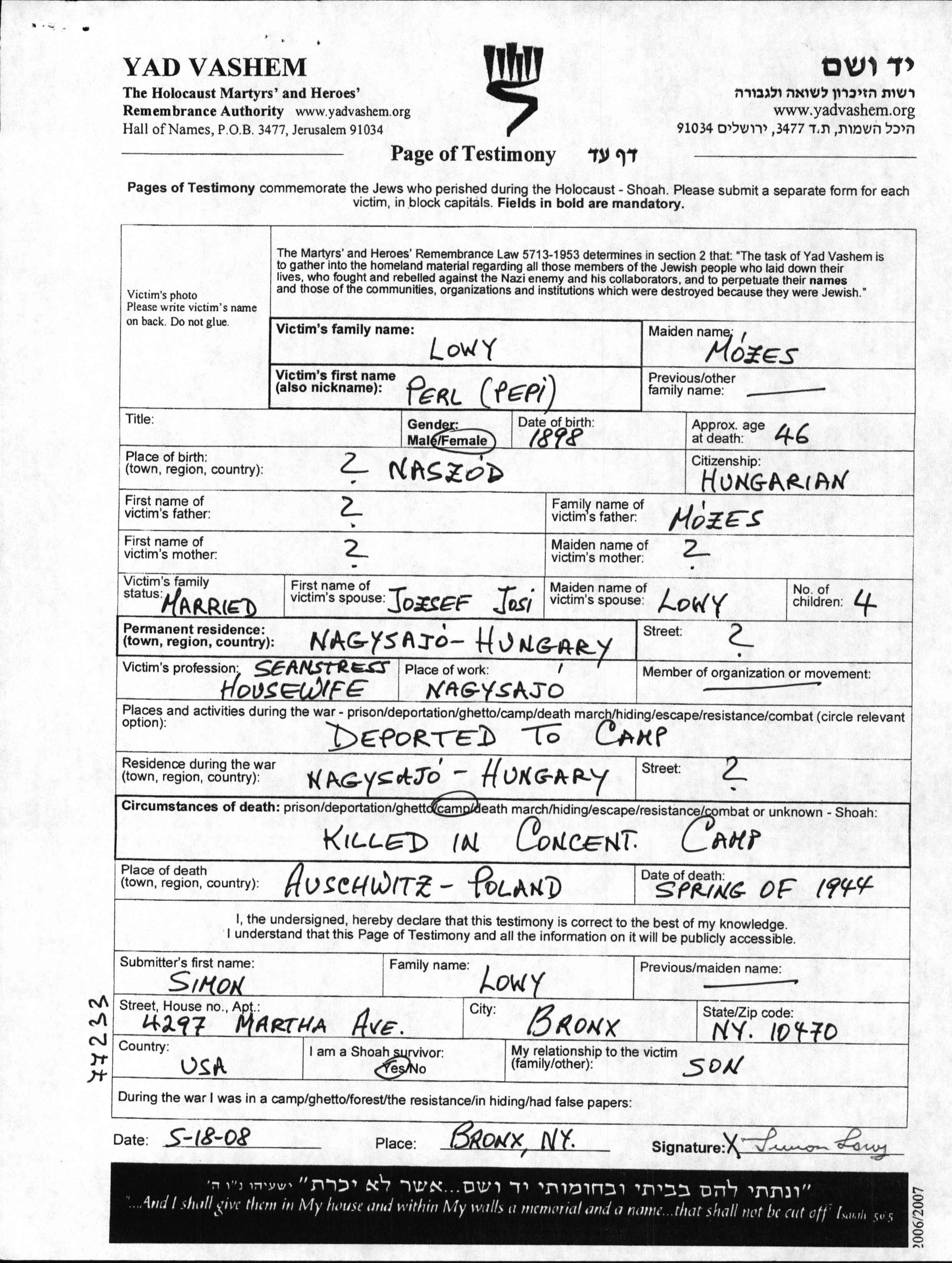 Perl Pepi Lowy לבית מוזס נולדה בNaszod שברומניה בשנת 1898. היא היתה תופרת ונשואה לJozsef. לפני מלחמת העולם השניה התגוררה בNagysajo שברומניה. בזמן המלחמה היא היתה בNagysajo שברומניה. היא נרצחה בשואה. מקום המוות: Auschwitz שבפולין בשנת 04/1944.