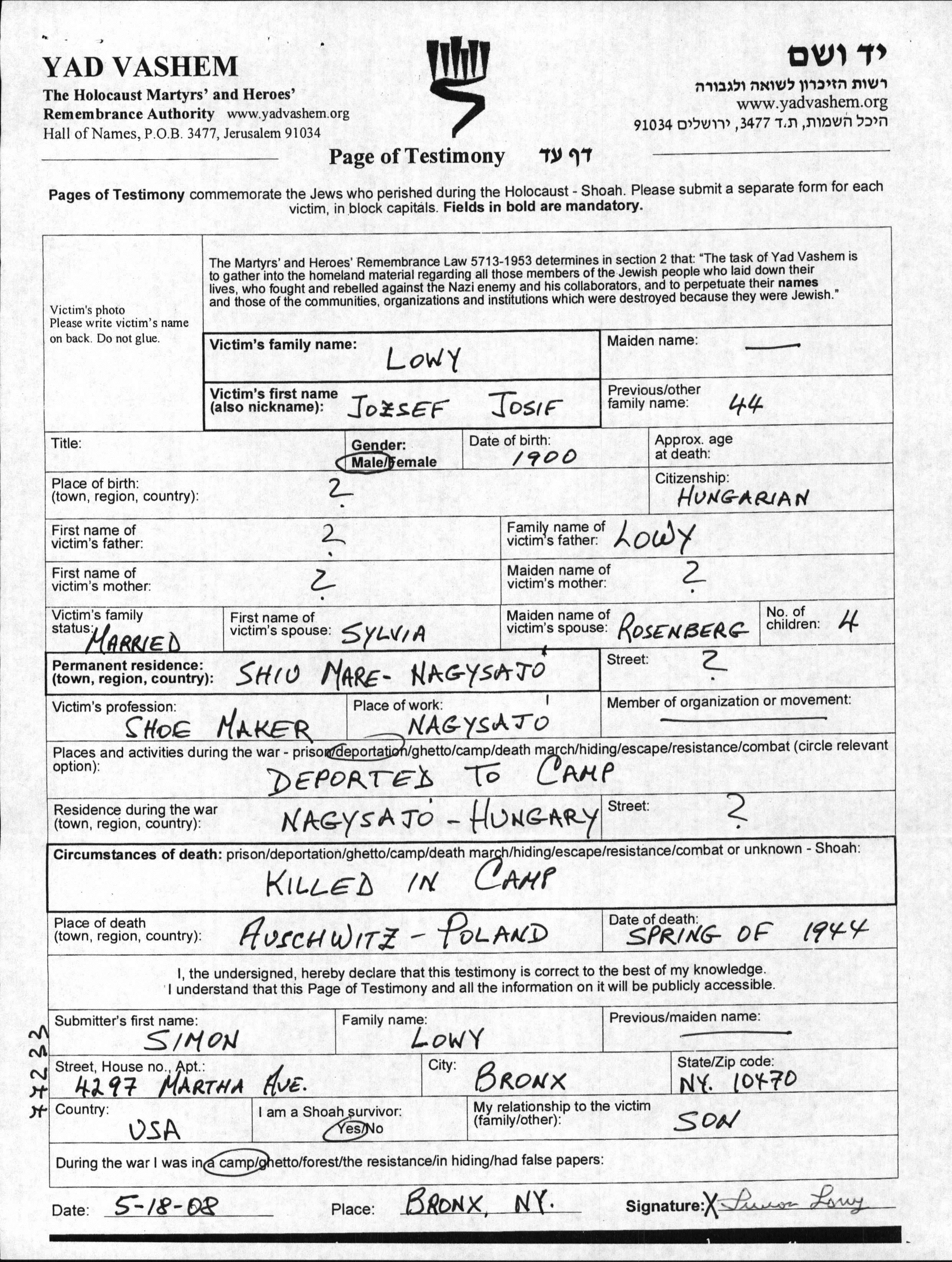 Jozsef Lowy נולד בהונגריה שבהונגריה בשנת 1900. הוא היה סנדלר ונשוי לSylvia לבית Rosenberg. לפני מלחמת העולם השניה התגורר בNagysajo שברומניה. בזמן המלחמה הוא היה בNagysajo שברומניה. הוא נרצח בשואה. מקום המוות: Auschwitz שבפולין בשנת 04/1944.