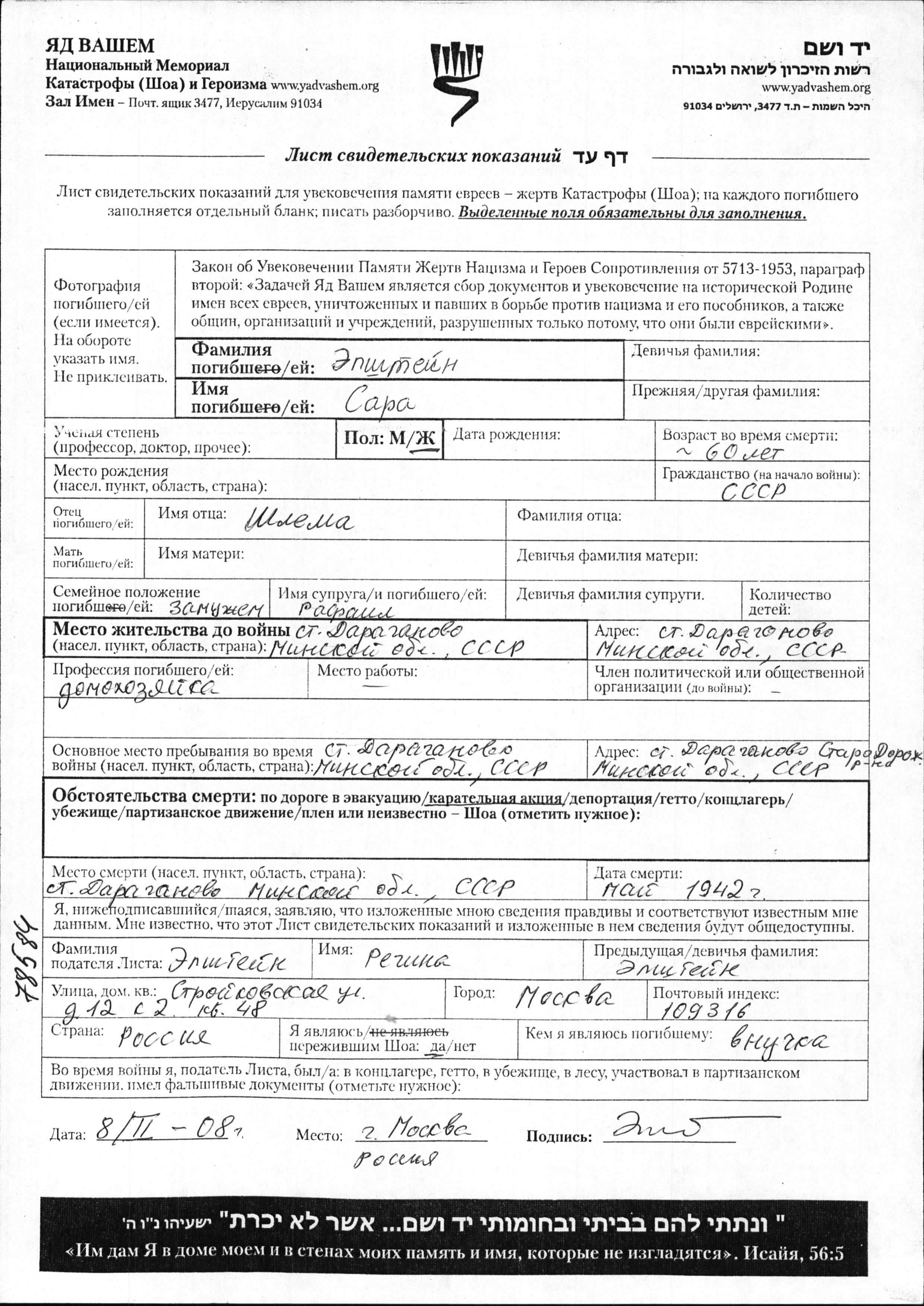 שרה נרצחה בשואה. מקום המוות: Daraganovo שבביאלורוסיה (ברה"מ) בשנת 05/1942.