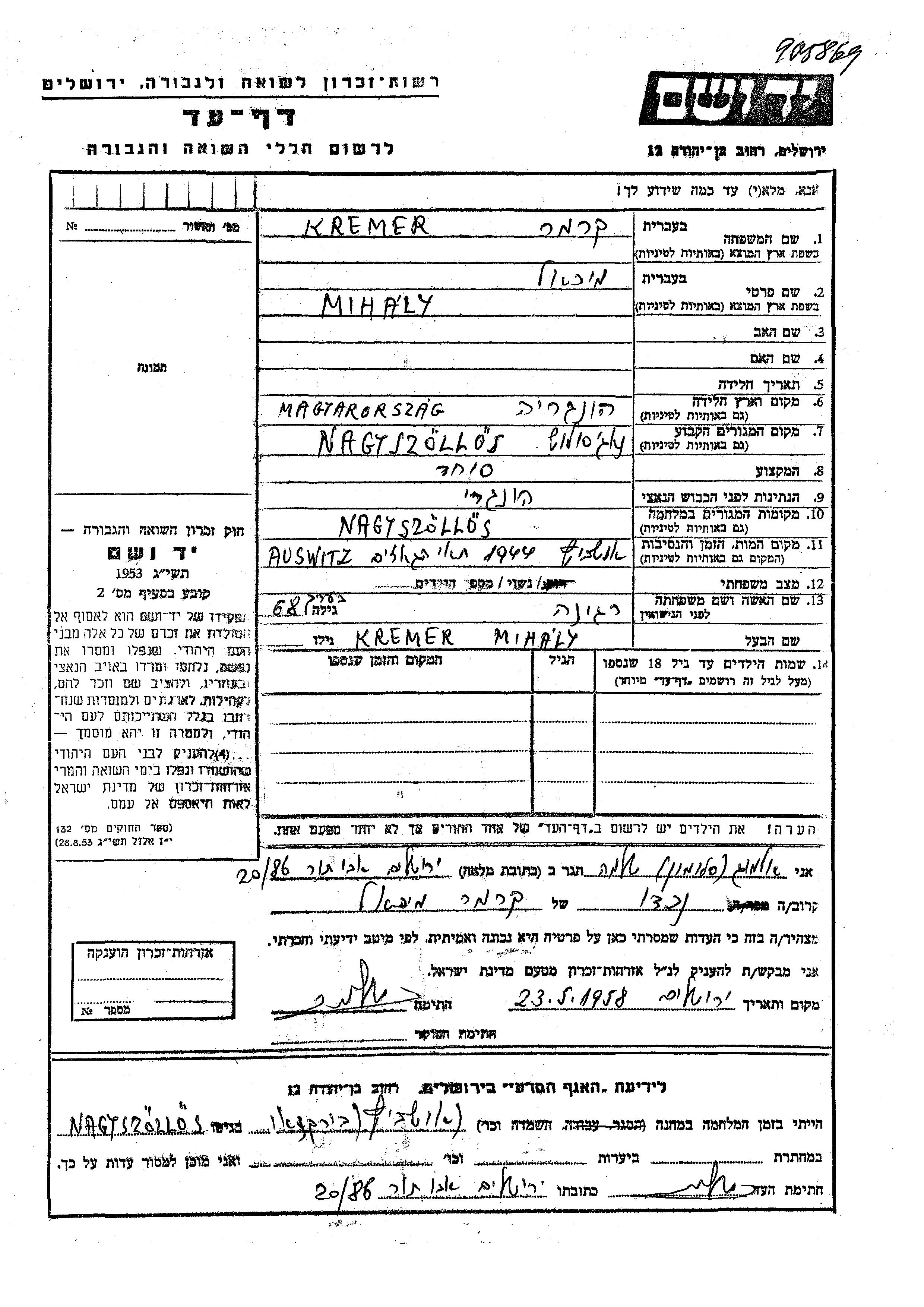 Mihaly קרמר נולד בהונגריה שבהונגריה. הוא היה סוחר ונשוי לרגינה. לפני מלחמת העולם השניה התגורר בNagyszollos שבצ'כוסלובקיה. בזמן המלחמה הוא היה בNagyszollos שבצ'כוסלובקיה. הוא נרצח בשואה. מקום המוות: Auschwitz שבפולין בשנת 1944.
