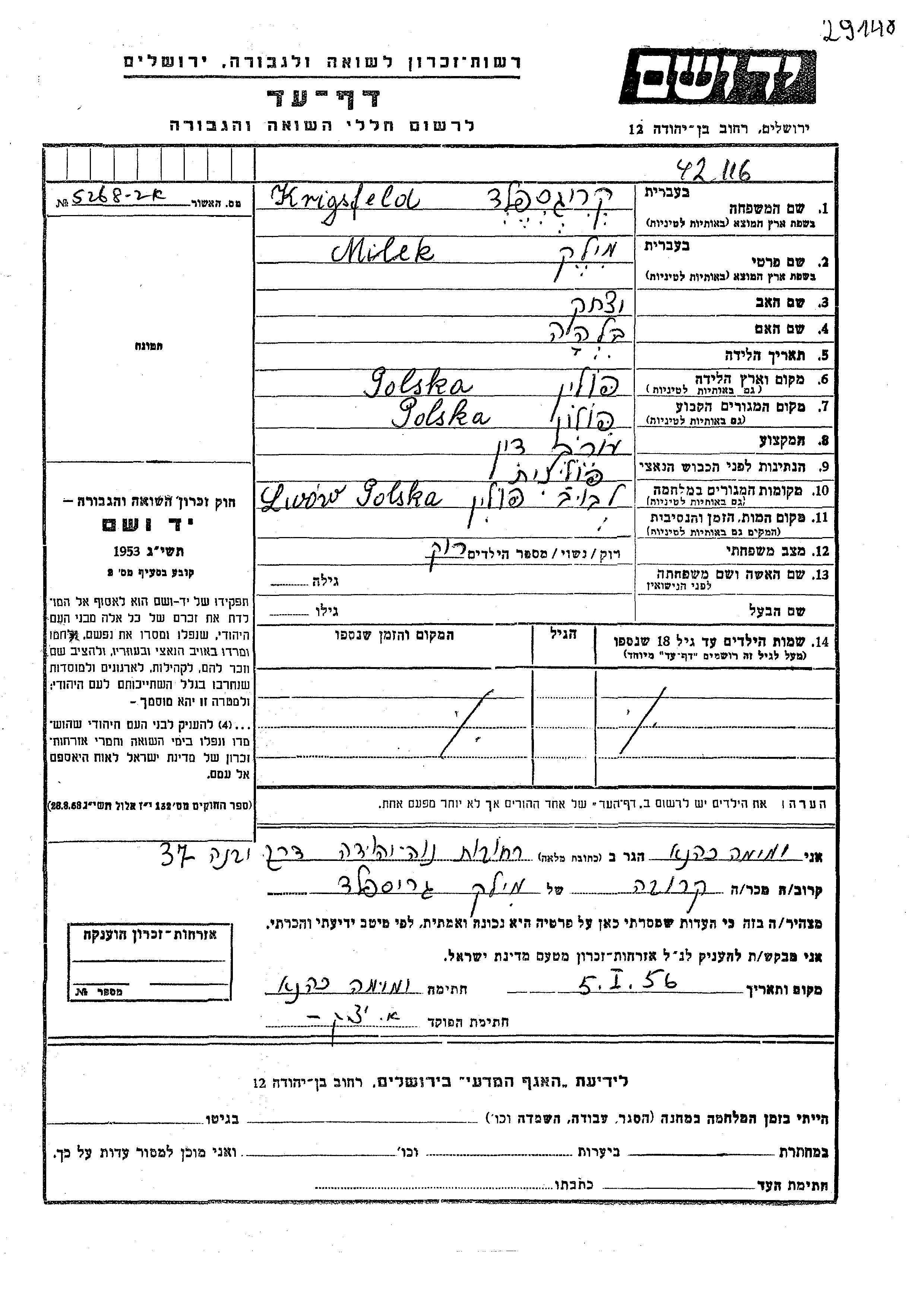מילק קריגספלד נולד בפולין ליצחק ובלהה. הוא היה עורך דין ורווק. לפני מלחמת העולם השניה התגורר בפולין. בזמן המלחמה הוא היה בLwow שבפולין.