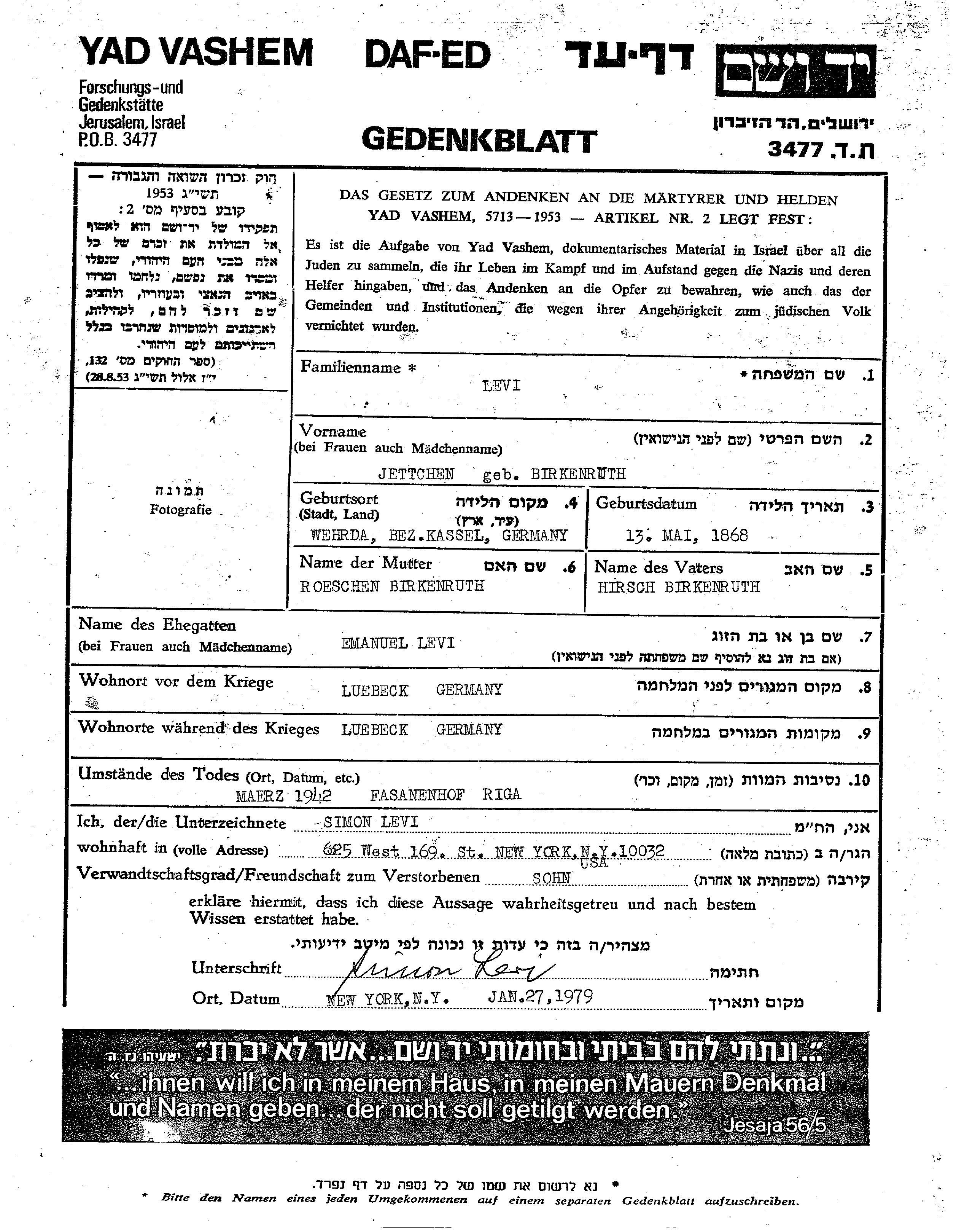 Jettchen לוי לבית Birkenruth נולדה בWehrda שבגרמניה בשנת 1868 לHirsch וRoeschen. היא היתה נשואה לעמנואל. לפני מלחמת העולם השניה התגוררה בLübeck שבגרמניה. בזמן המלחמה היא היתה בLübeck שבגרמניה. היא נרצחה בשואה. מקום המוות: Riga שבלטביה בשנת 03/1942.