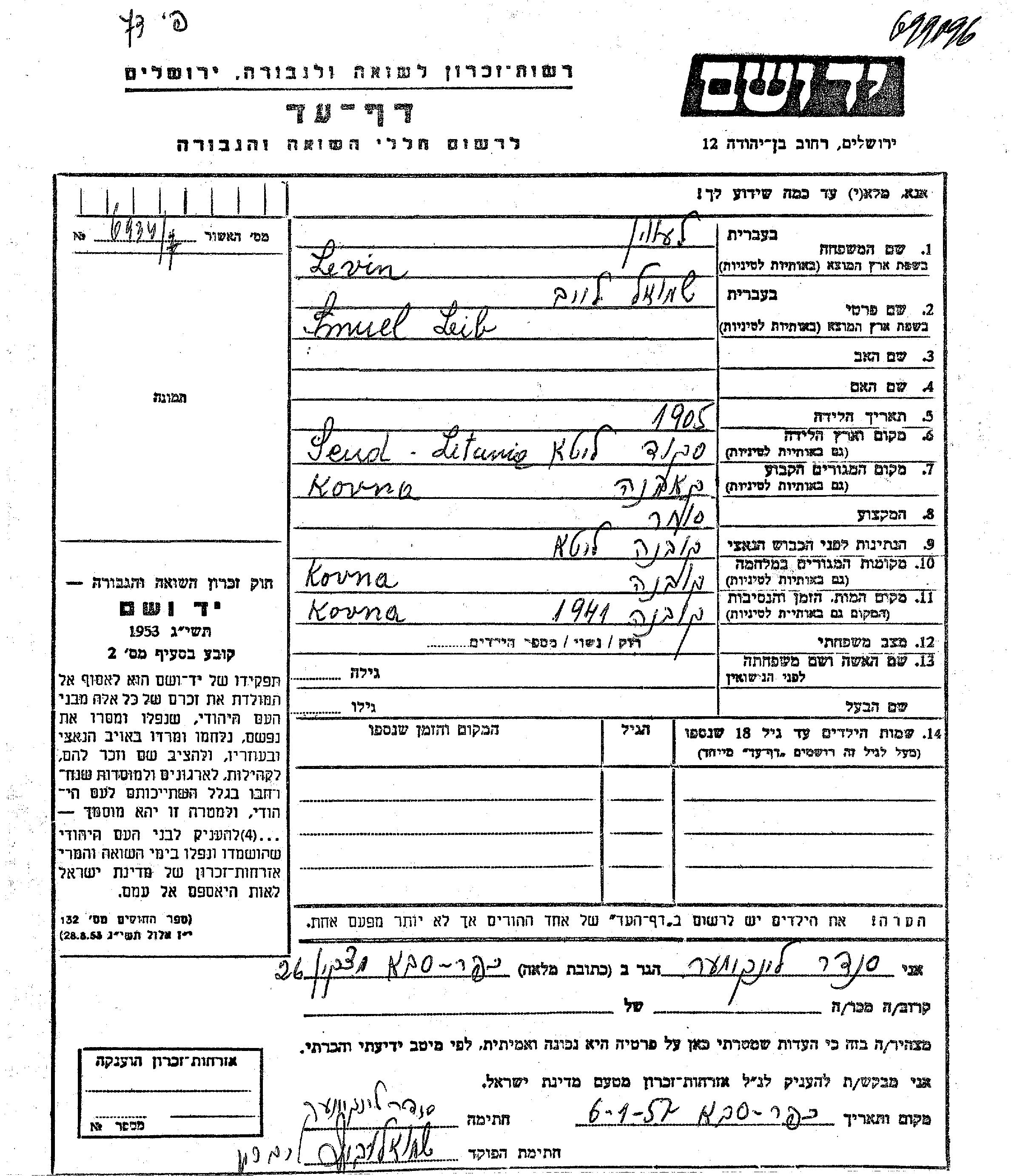 Smuel לייב לוין נולד בSkud שבליטא בשנת 1905. הוא היה סוחר. לפני מלחמת העולם השניה התגורר בKovno שבליטא. בזמן המלחמה הוא היה בKovno שבליטא. הוא נרצח בשואה. מקום המוות: Kovna שבליטא בשנת 1941.