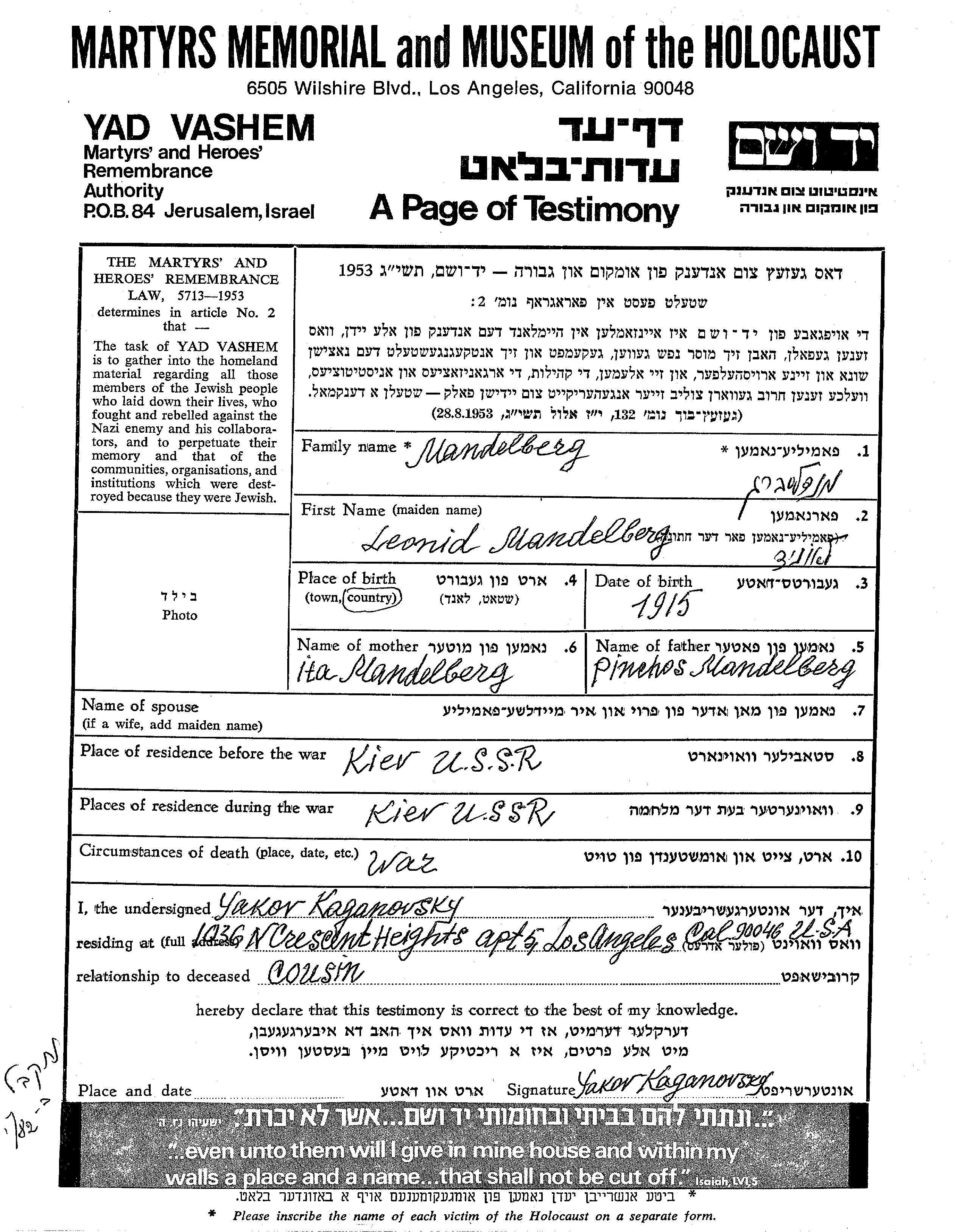 לאוניד מנדלברג נולד בשנת 1915 לPinchos ואיטה. לפני מלחמת העולם השניה התגורר בKiev שבאוקראינה (ברה"מ). בזמן המלחמה הוא היה בKiev שבאוקראינה (ברה"מ). לאוניד נרצח בשואה.