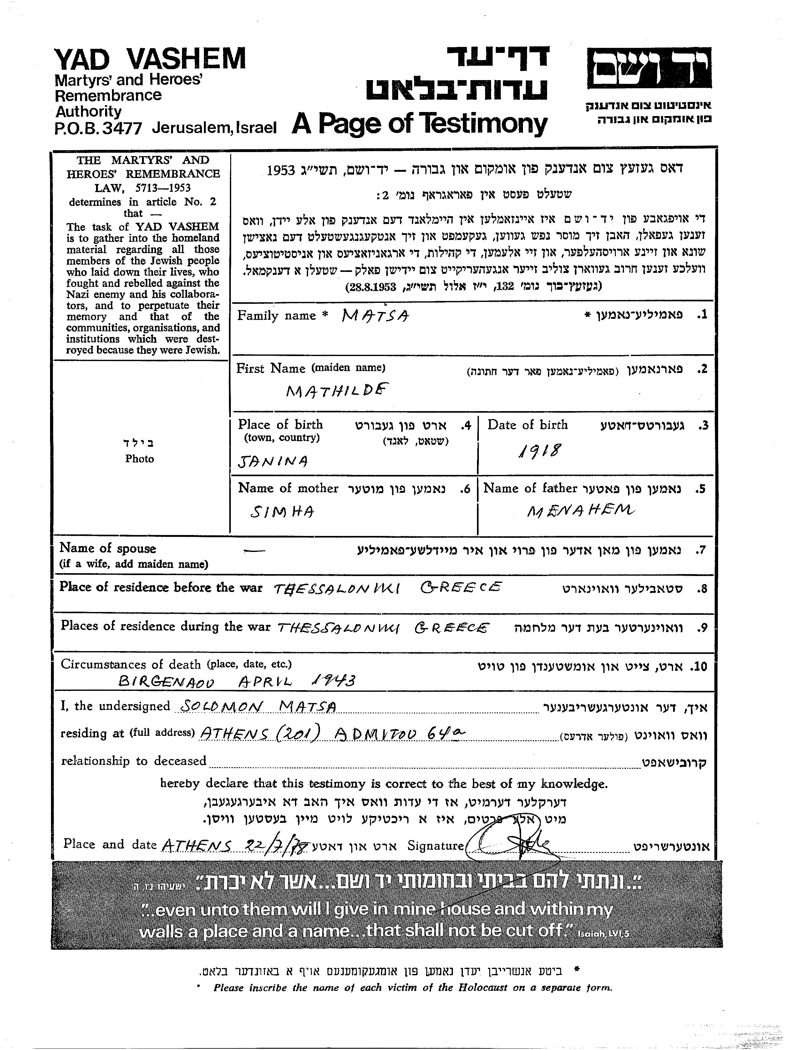 Mathilde Matsa נולדה בJanina שביון בשנת 1918 לMenahem וSimha. לפני מלחמת העולם השניה התגוררה בThessaloniki שביון. בזמן המלחמה היא היתה בThessaloniki שביון. היא נרצחה בשואה. מקום המוות: Birkenau שבפולין בשנת 04/1943.