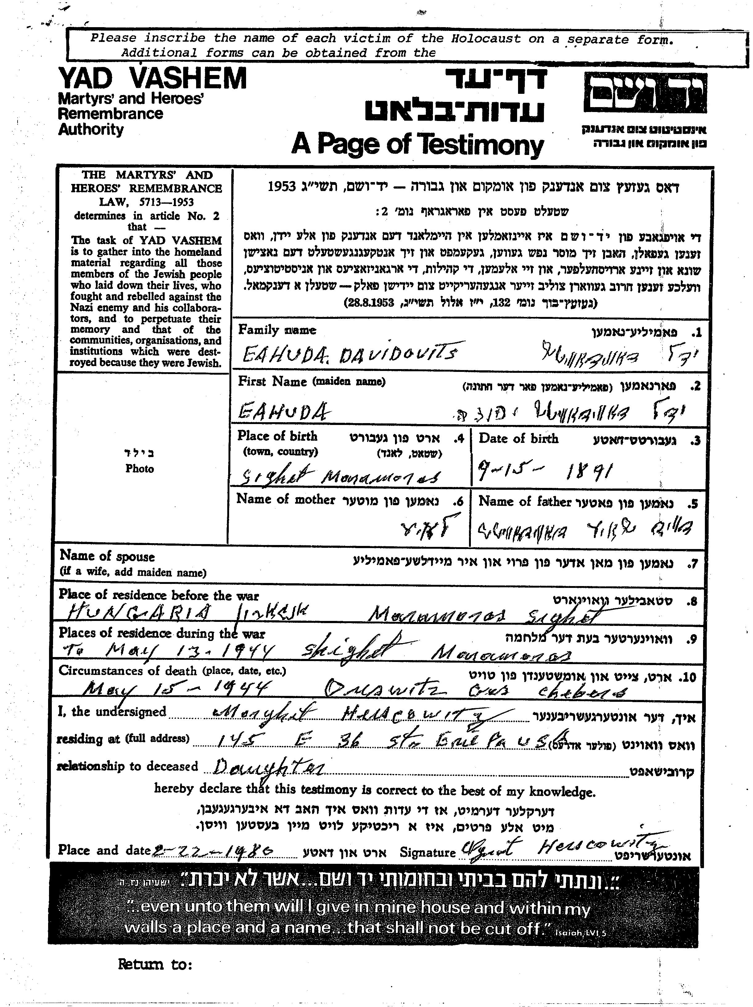 Davidovits Eahuda 1891 Sighet, רומניה דף-עד