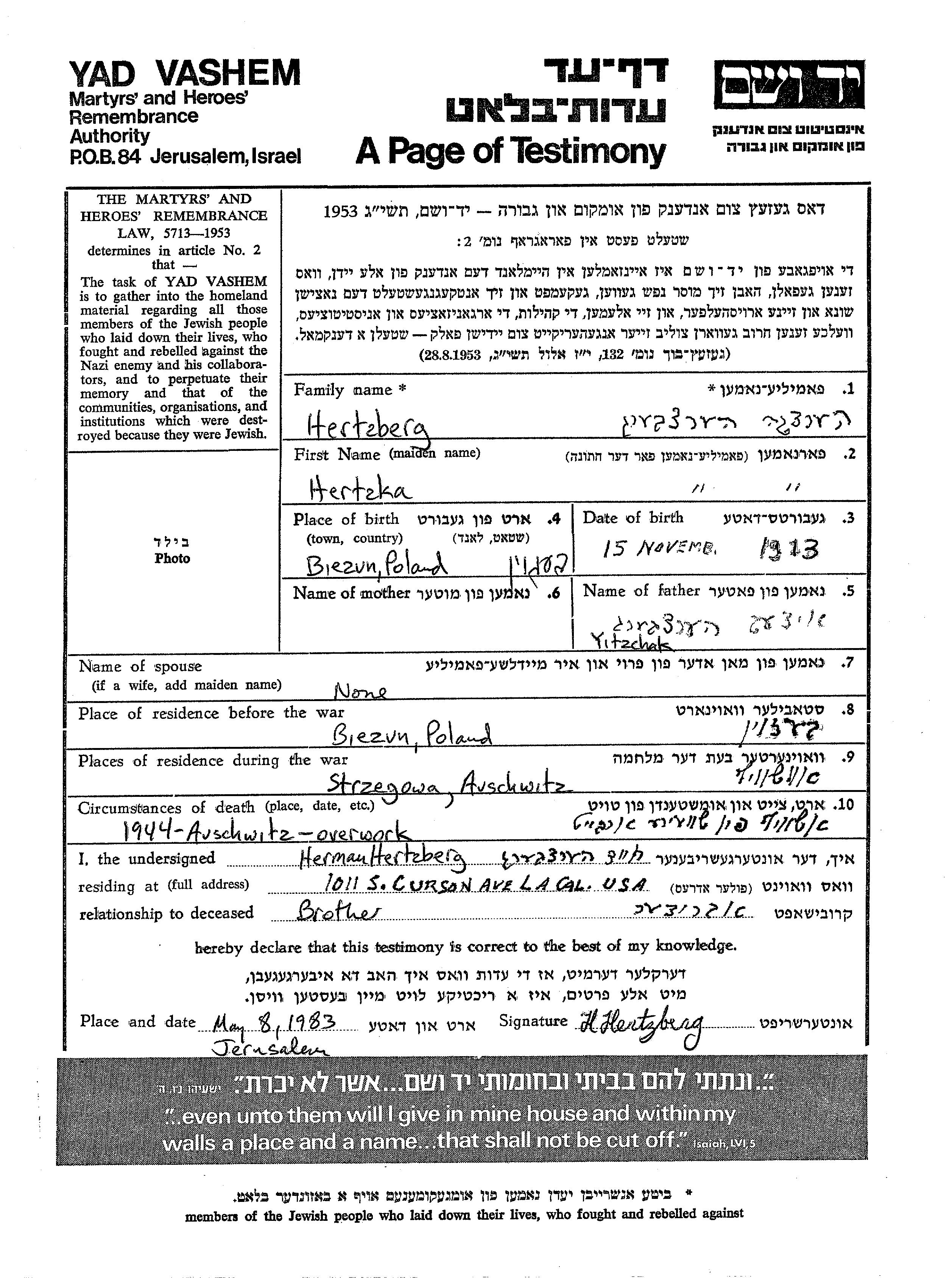 הרצקה הרצברג נולד בBiezun שבפולין בשנת 1913 לYitzchak. הוא היה רווק. לפני מלחמת העולם השניה התגורר בBiezun שבפולין. בזמן המלחמה הוא היה בStrzegowa שבפולין.