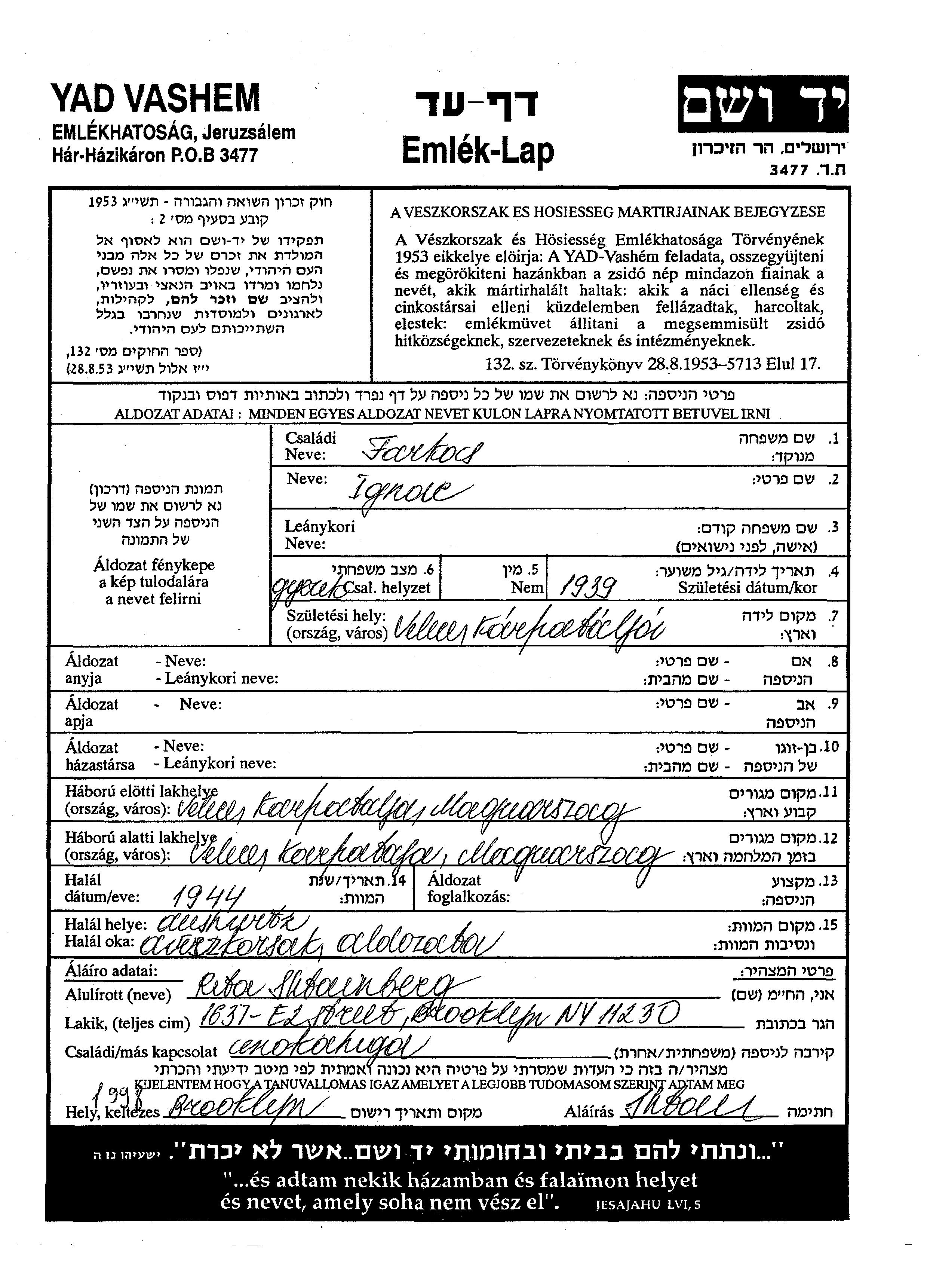 Ignac Farkas נולד בVelete שבצ'כוסלובקיה בשנת 1939. הוא היה ילד. לפני מלחמת העולם השניה התגורר בVelete שבצ'כוסלובקיה. בזמן המלחמה הוא היה בVelete שבצ'כוסלובקיה. הוא נרצח בשואה. מקום המוות: Auschwitz שבפולין בשנת 1944.