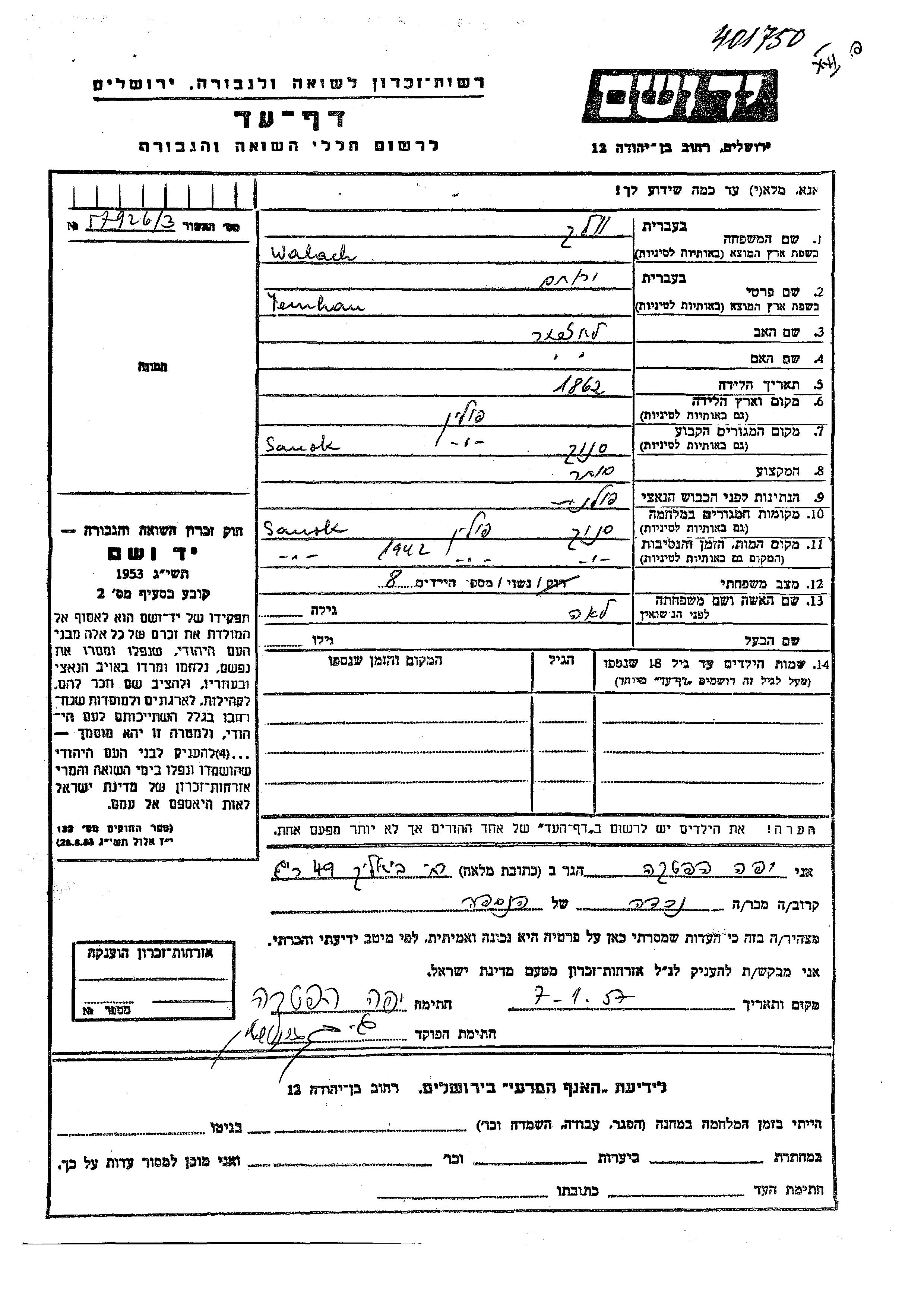 Yeruham Walach וולך נולד בפולין בשנת 1862. הוא היה סוחר ונשוי ללאה. לפני מלחמת העולם השניה התגורר בSanok שבפולין. בזמן המלחמה הוא היה בSanok שבפולין. הוא נרצח בשואה. מקום המוות: Sanok שבפולין בשנת 1942.