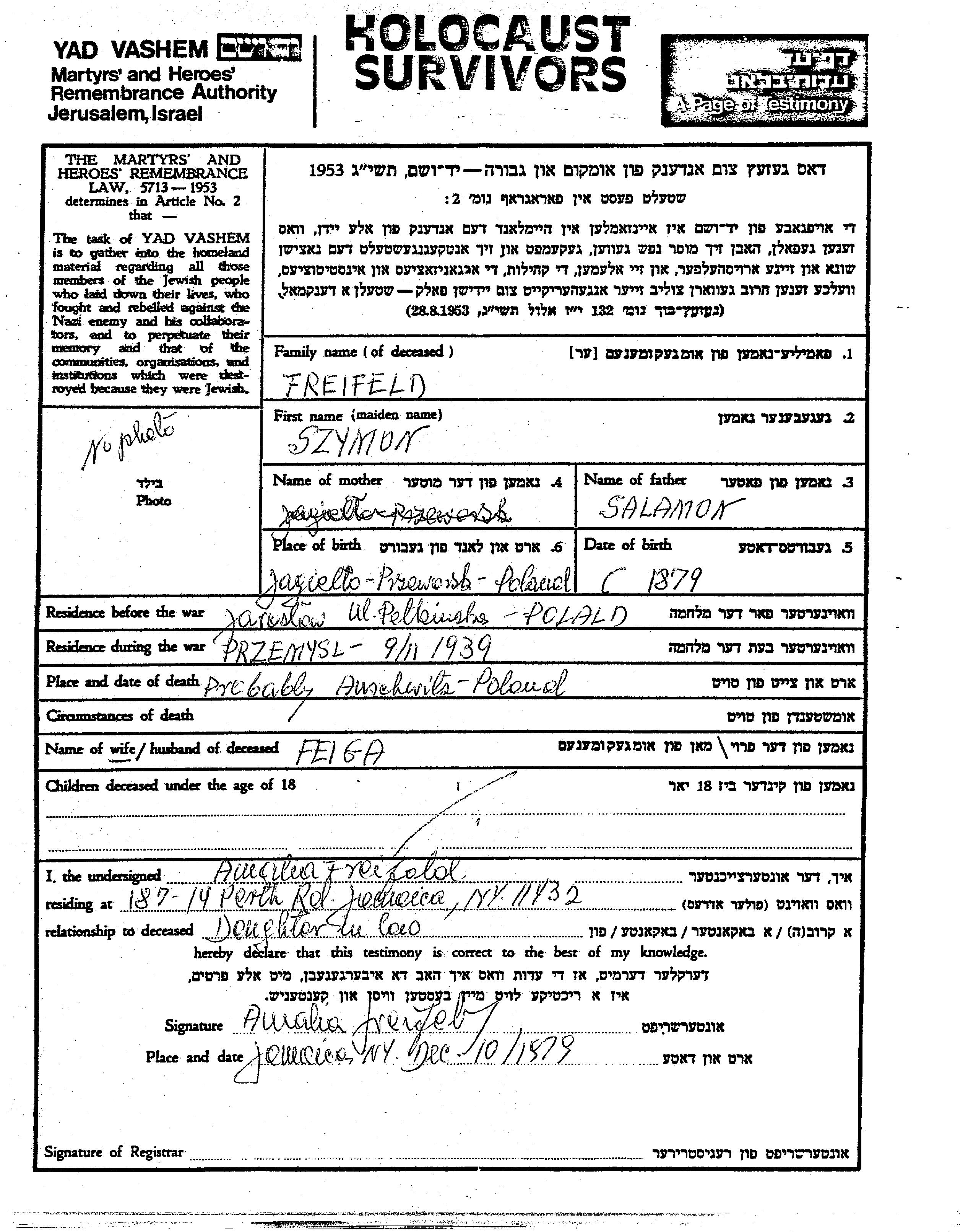 פרייפלד Szymon 1879 Jaroslaw, פולין דף-עד