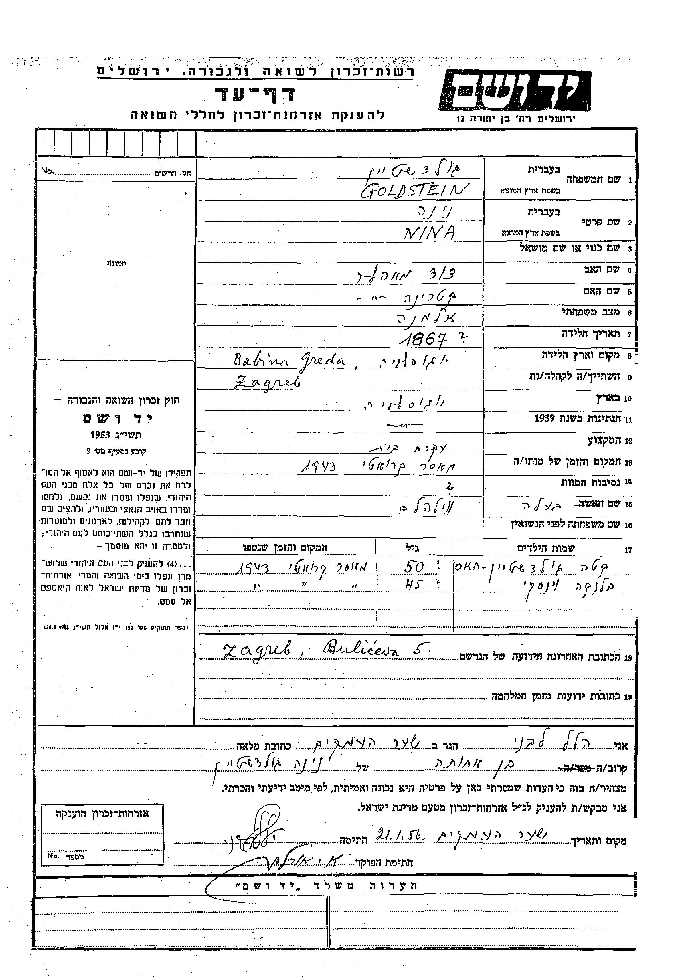 נינה Goldstein לבית מאהלר נולדה בBabina Greda שביוגוסלביה בשנת 1867 לדוד וקטרינה. היא היתה עקרת בית ואלמנה לווילהלם. לפני מלחמת העולם השניה התגוררה בZagreb שביוגוסלביה. בזמן המלחמה היא היתה בZagreb שביוגוסלביה.