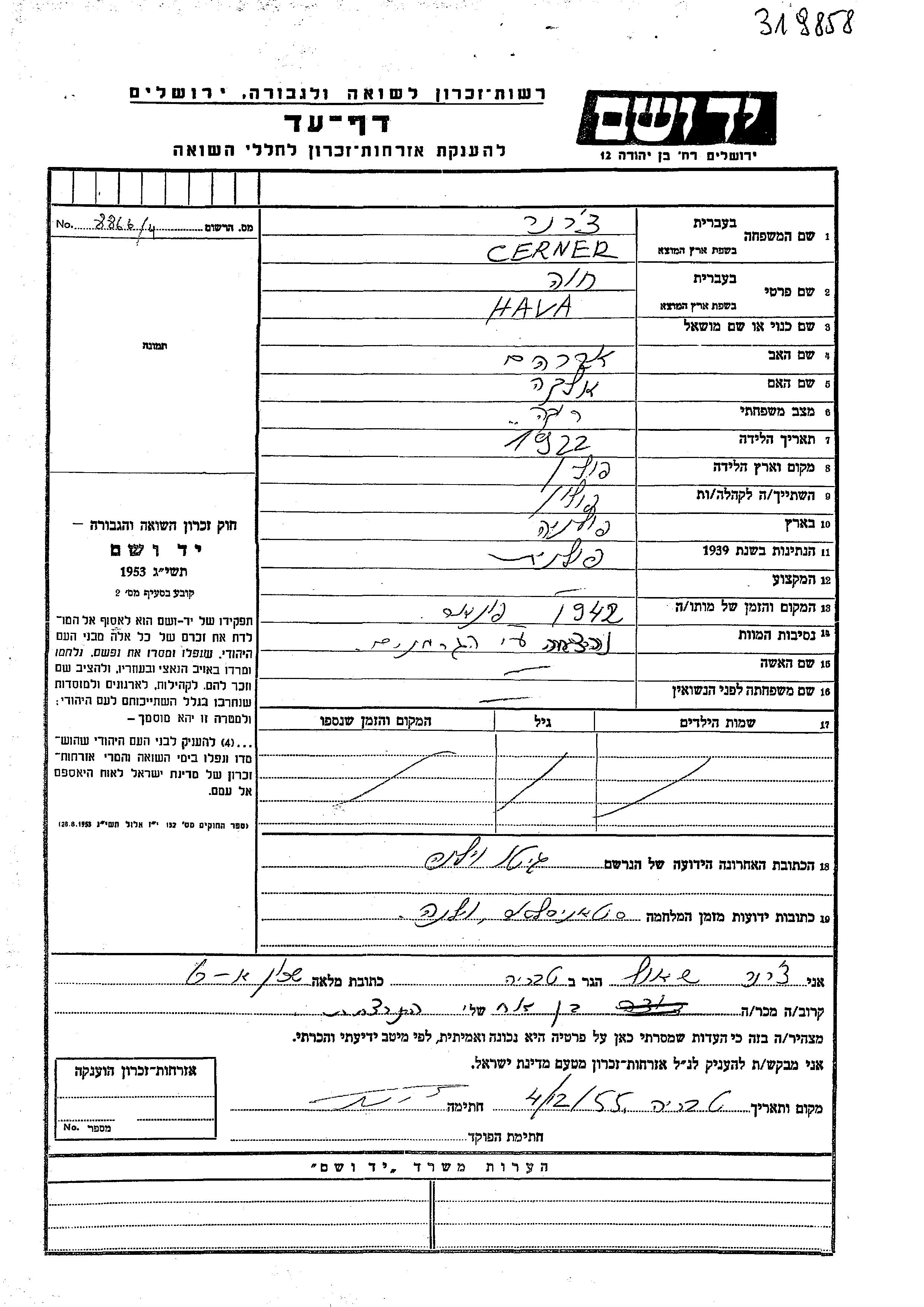 Hava Cerner נולדה בפולין בשנת 1922 לאברהם ואלקה. היא היתה רווקה. לפני מלחמת העולם השניה התגוררה בWilno שבפולין. בזמן המלחמה היא היתה בStanislau שבפולין.