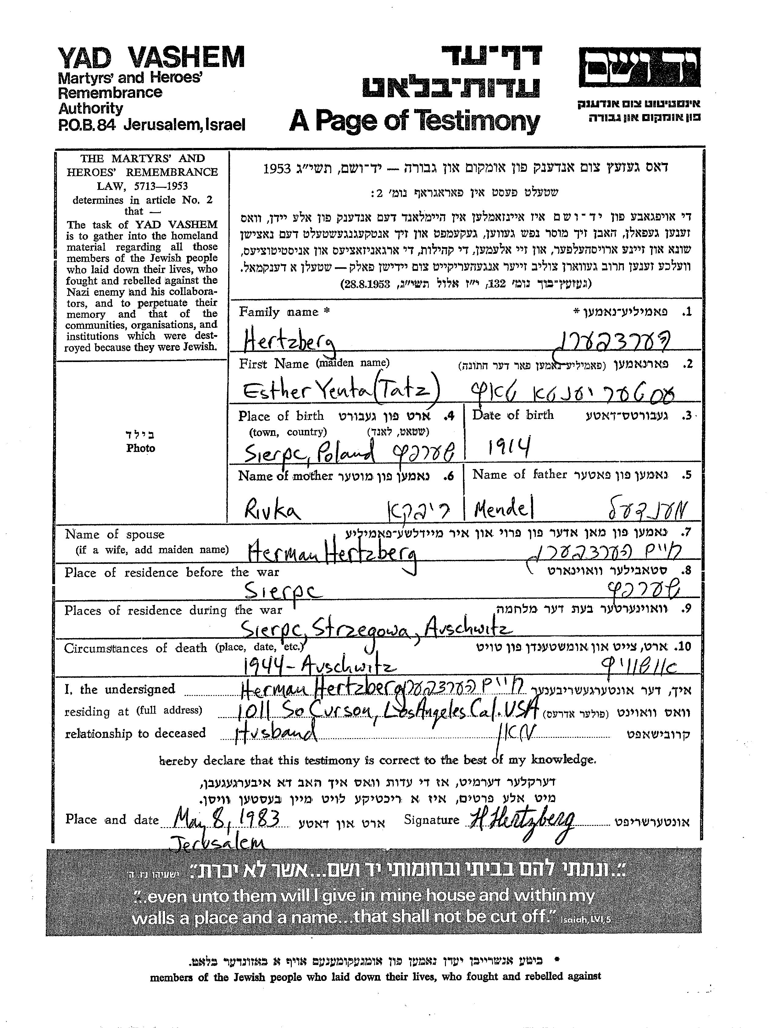 הרצברג אסתר יענטא 1914 Sierpc, פולין דף-עד