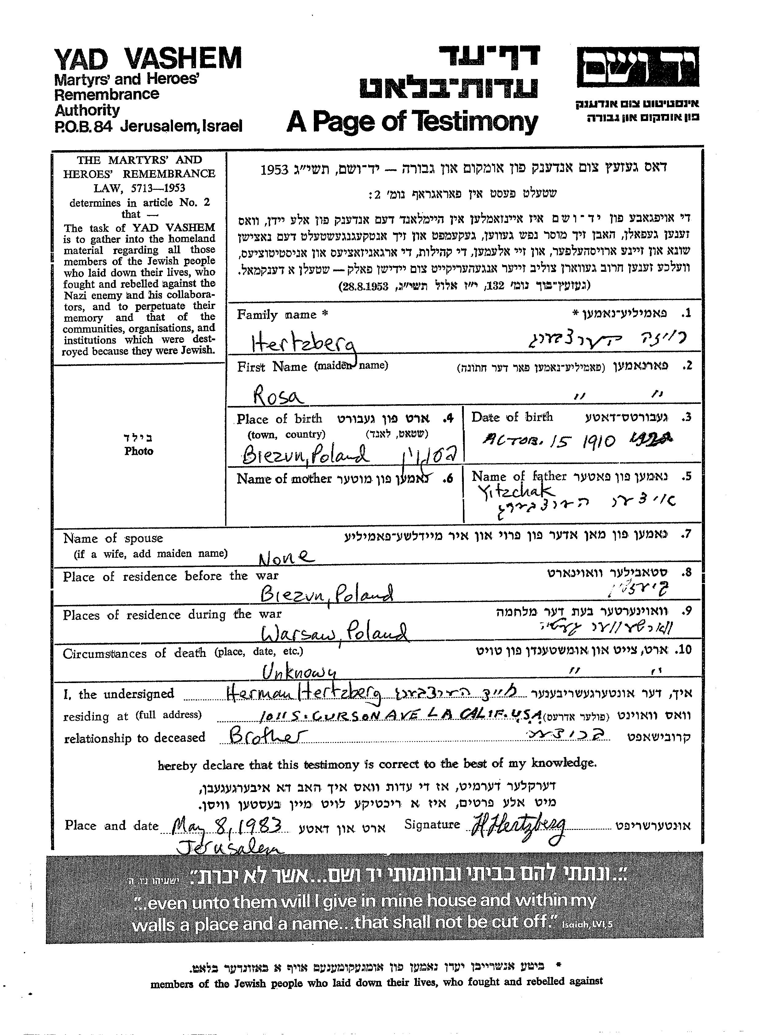 Rosa הרצברג נולדה בBiezun שבפולין בשנת 1910 לYitzchak. לפני מלחמת העולם השניה התגוררה בBiezun שבפולין. בזמן המלחמה היא היתה בWarszawa שבפולין.