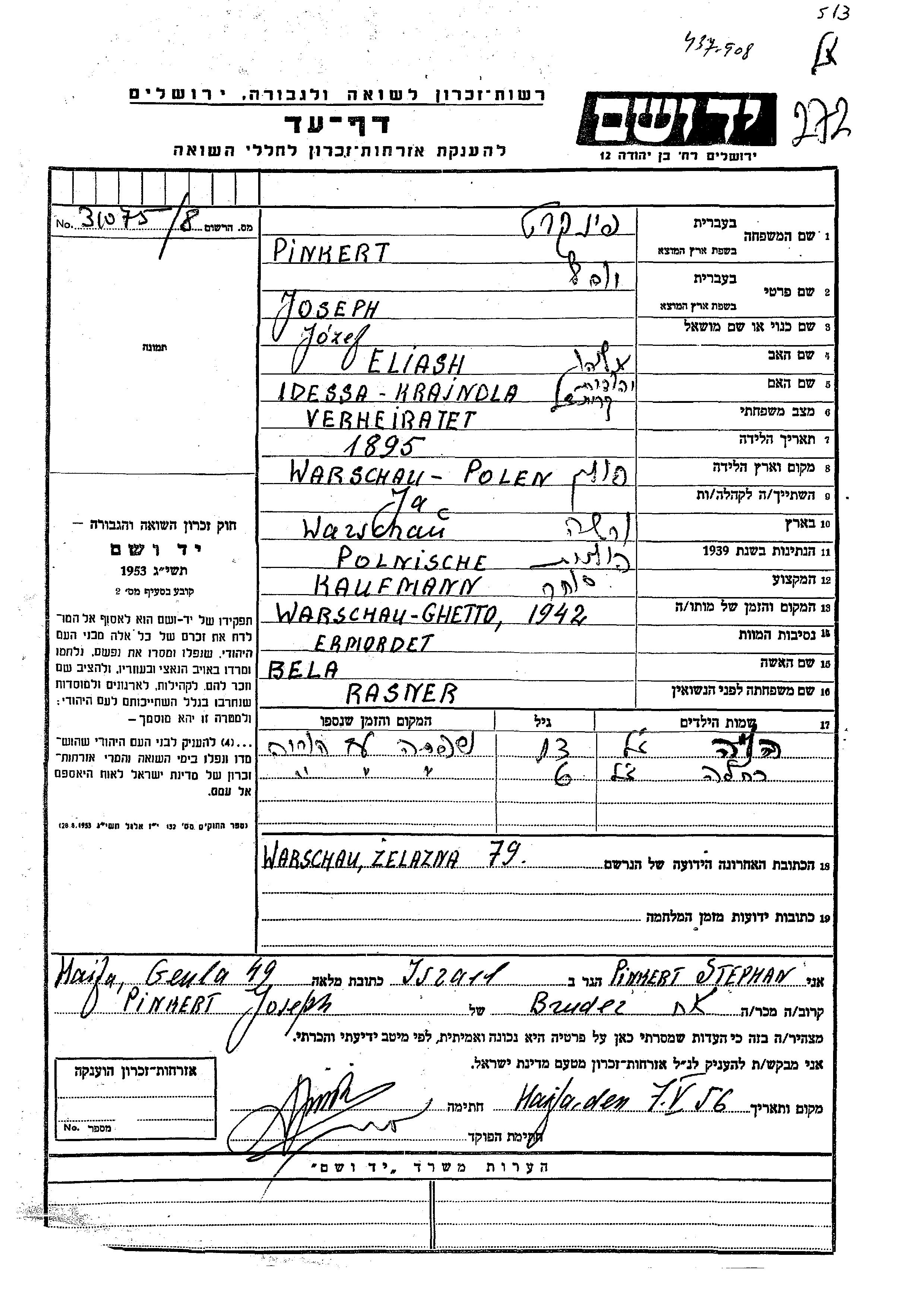 יוסף נרצח בשואה. מקום המוות: Warschau שבפולין בשנת 1942.