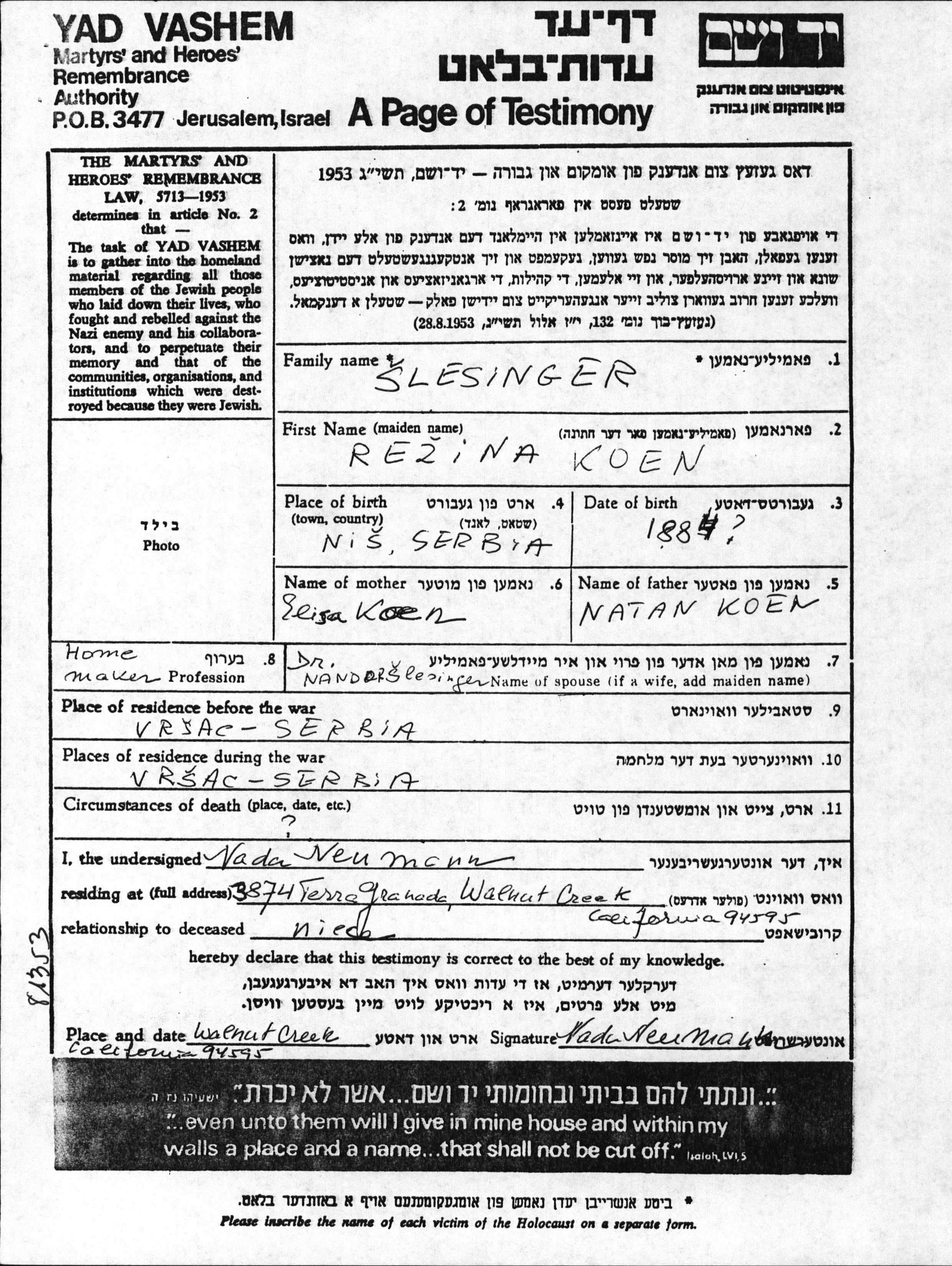 Rezina Slesinger לבית Koen נולדה בNis שביוגוסלביה בשנת 1884 לנתן וElisa. היא היתה Home maker ונשואה לננדור. לפני מלחמת העולם השניה התגוררה בVrsac שביוגוסלביה. בזמן המלחמה היא היתה בVrsac שביוגוסלביה. היא נרצחה בשואה.