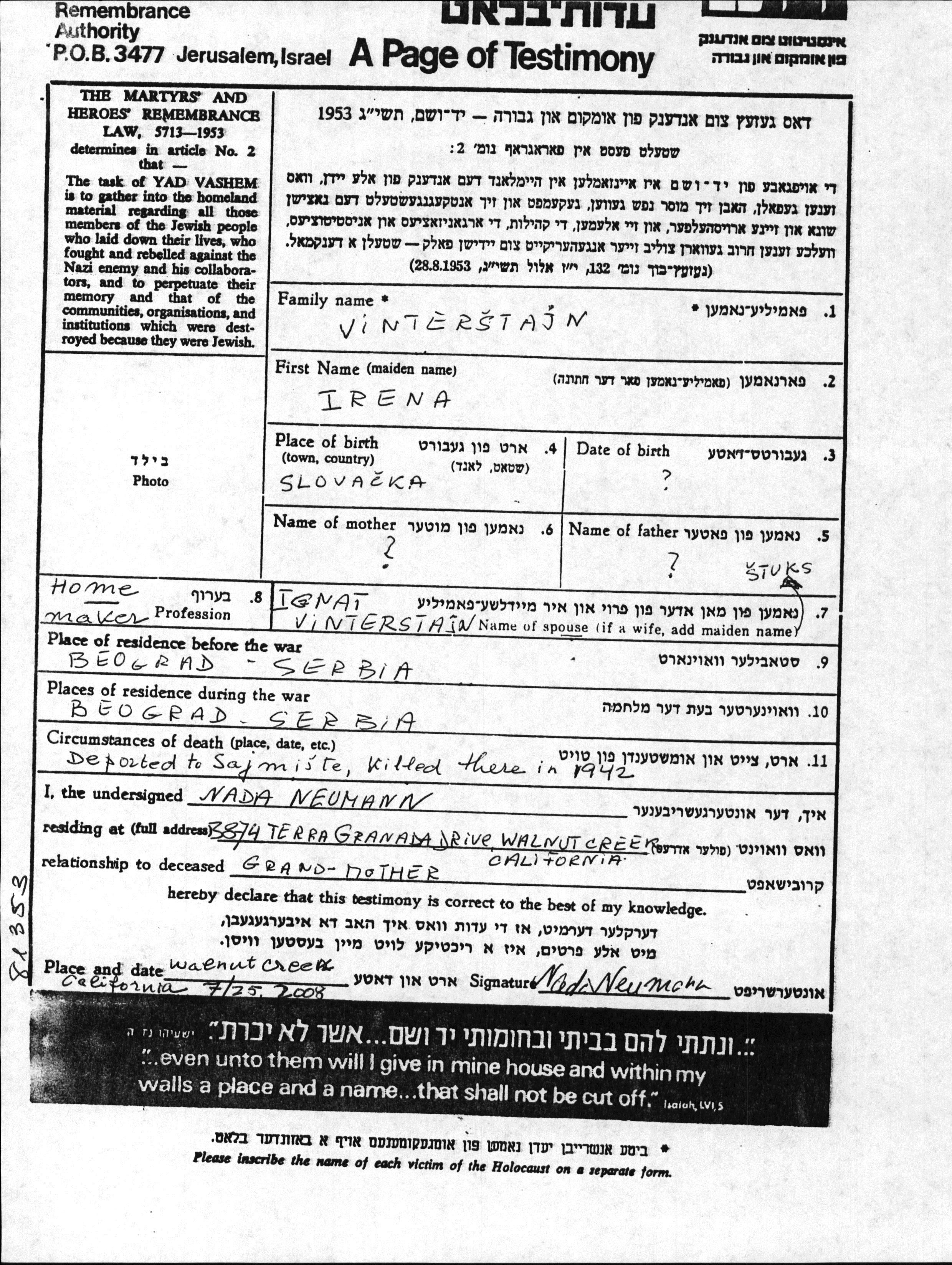 אירנה Vinterstajn לבית Stuks נולדה בSlovakia שבצ'כוסלובקיה. היא היתה Home maker ונשואה לIgnat. לפני מלחמת העולם השניה התגוררה בBeograd שביוגוסלביה. בזמן המלחמה היא היתה בBeograd שביוגוסלביה. אירנה נרצחה בשואה. מקום המוות: Sajmiste שביוגוסלביה בשנת 1942.