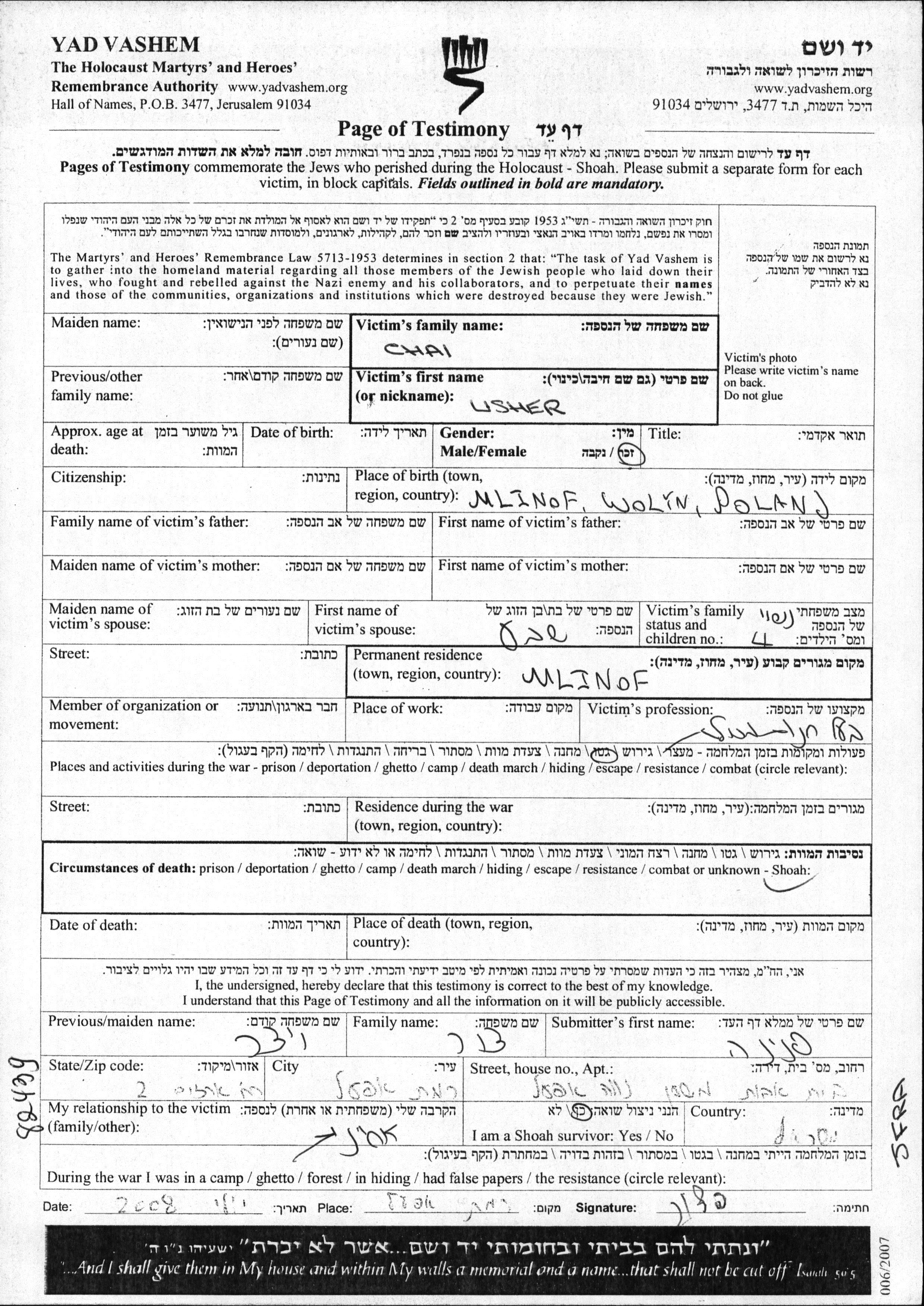 Usher Chai נולד בMłynów שבפולין. הוא היה בעל חנות מכולת ונשוי לשבע. לפני מלחמת העולם השניה התגורר בMłynów שבפולין. בזמן המלחמה הוא היה בMłynów שבפולין.