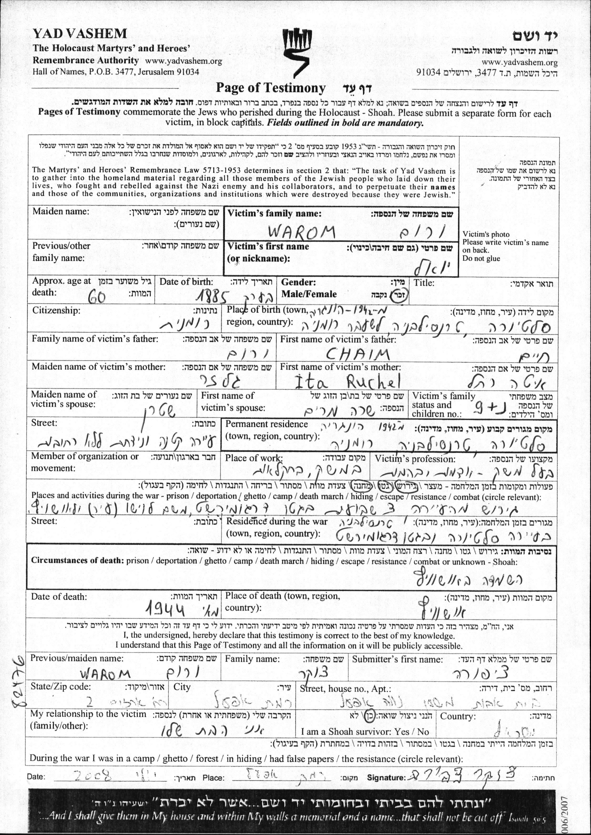 יואל Warom נולד בSlatioara שברומניה בשנת 1885 לחיים ואיטה Ruchel לבית גלזר. הוא היה בעל משק ונשוי לשרה מרים לבית שטרן. לפני מלחמת העולם השניה התגורר בSlatioara שברומניה. בזמן המלחמה הוא היה בDragomiresti שברומניה.