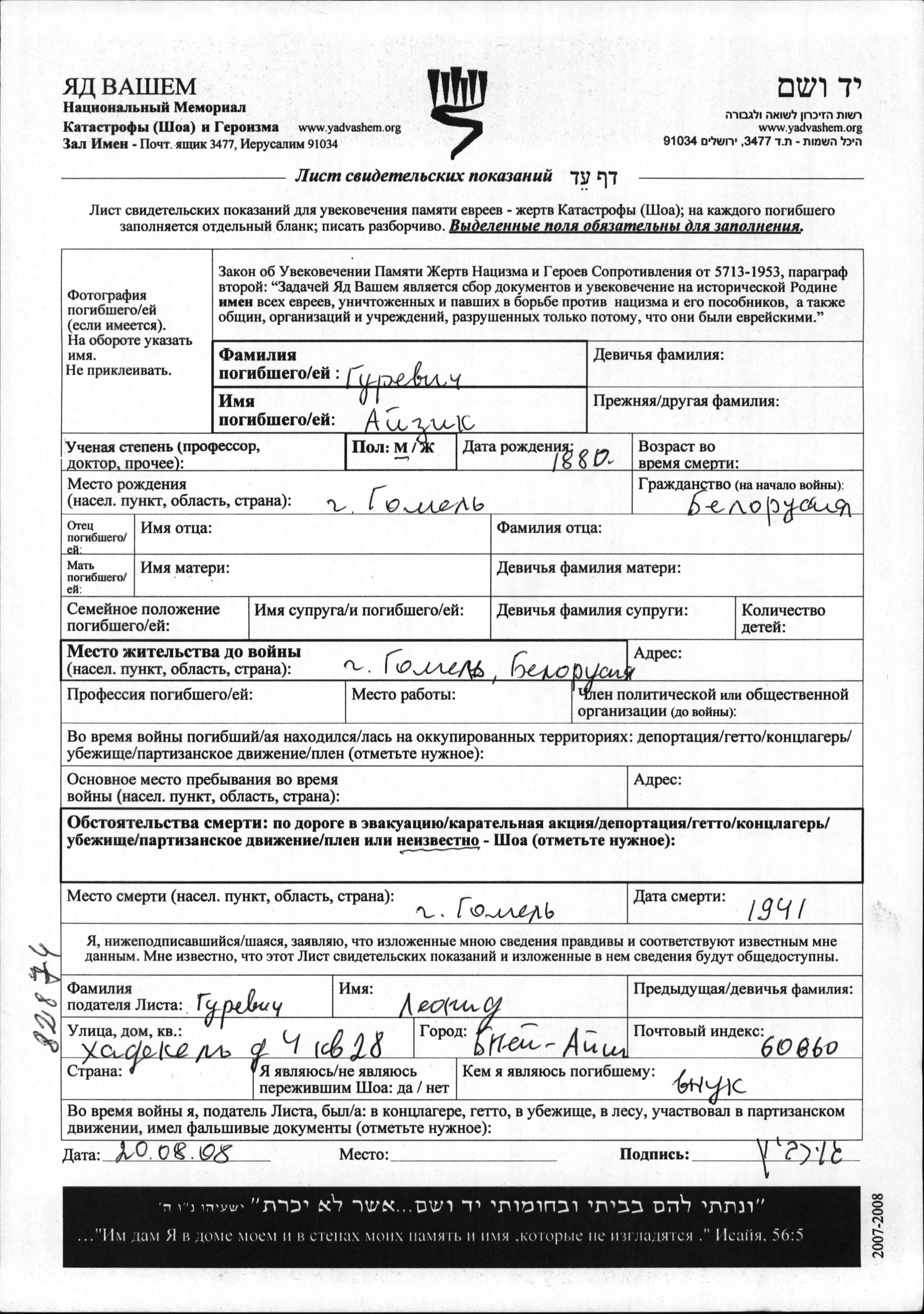 אייזייק נרצח בשואה. מקום המוות: Gomel שבביאלורוסיה (ברה"מ) בשנת 1941.