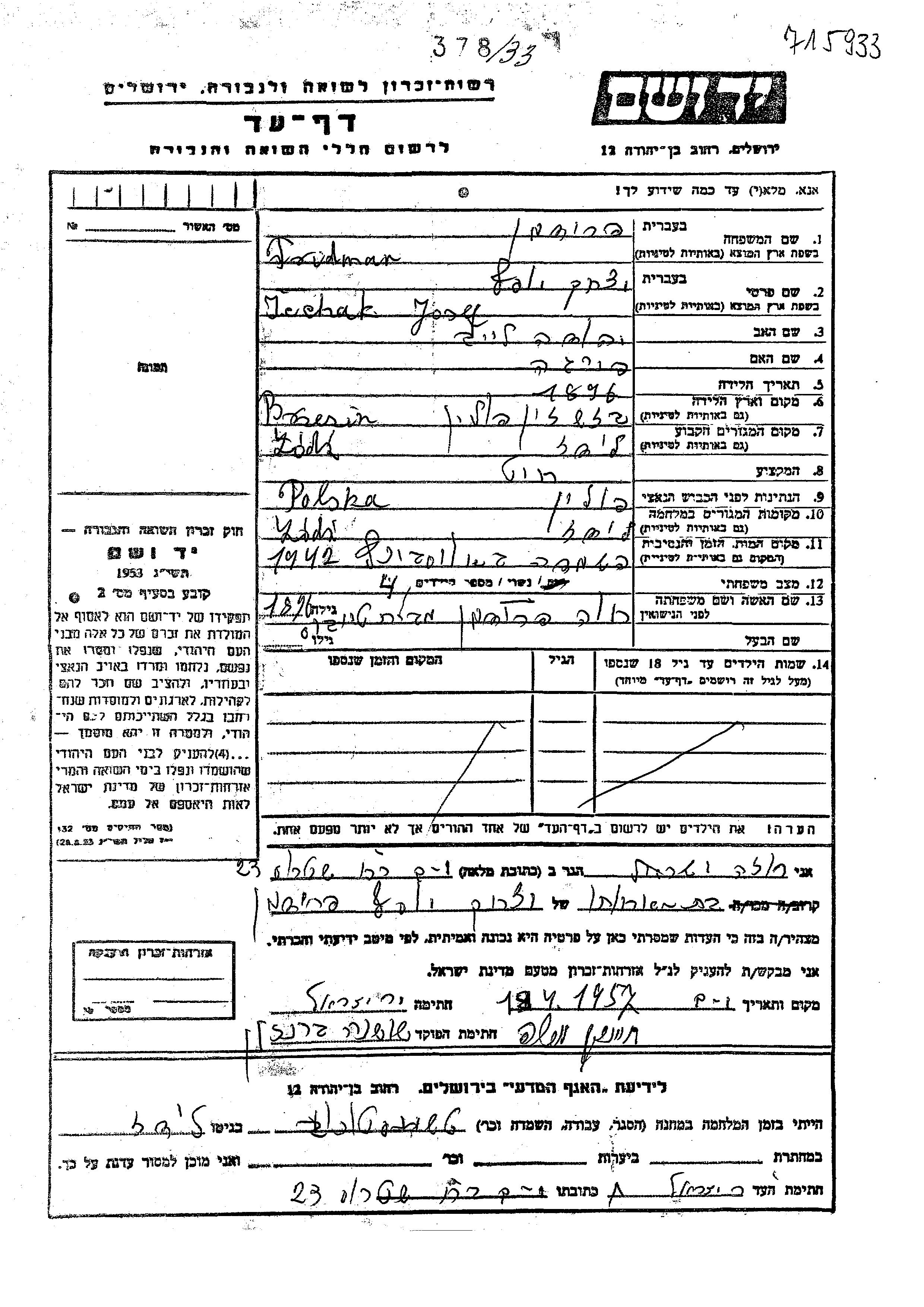 Icchak Josef פרידמן נולד בBrzezin שבפולין בשנת 1896 ליהודה לייב ופייגה. הוא היה חייט ונשוי לחוה לבית טייבוס. לפני מלחמת העולם השניה התגורר בLodz שבפולין. בזמן המלחמה הוא היה בLodz שבפולין. הוא נרצח בשואה. מקום המוות: Auschwitz שבפולין בשנת 1942.