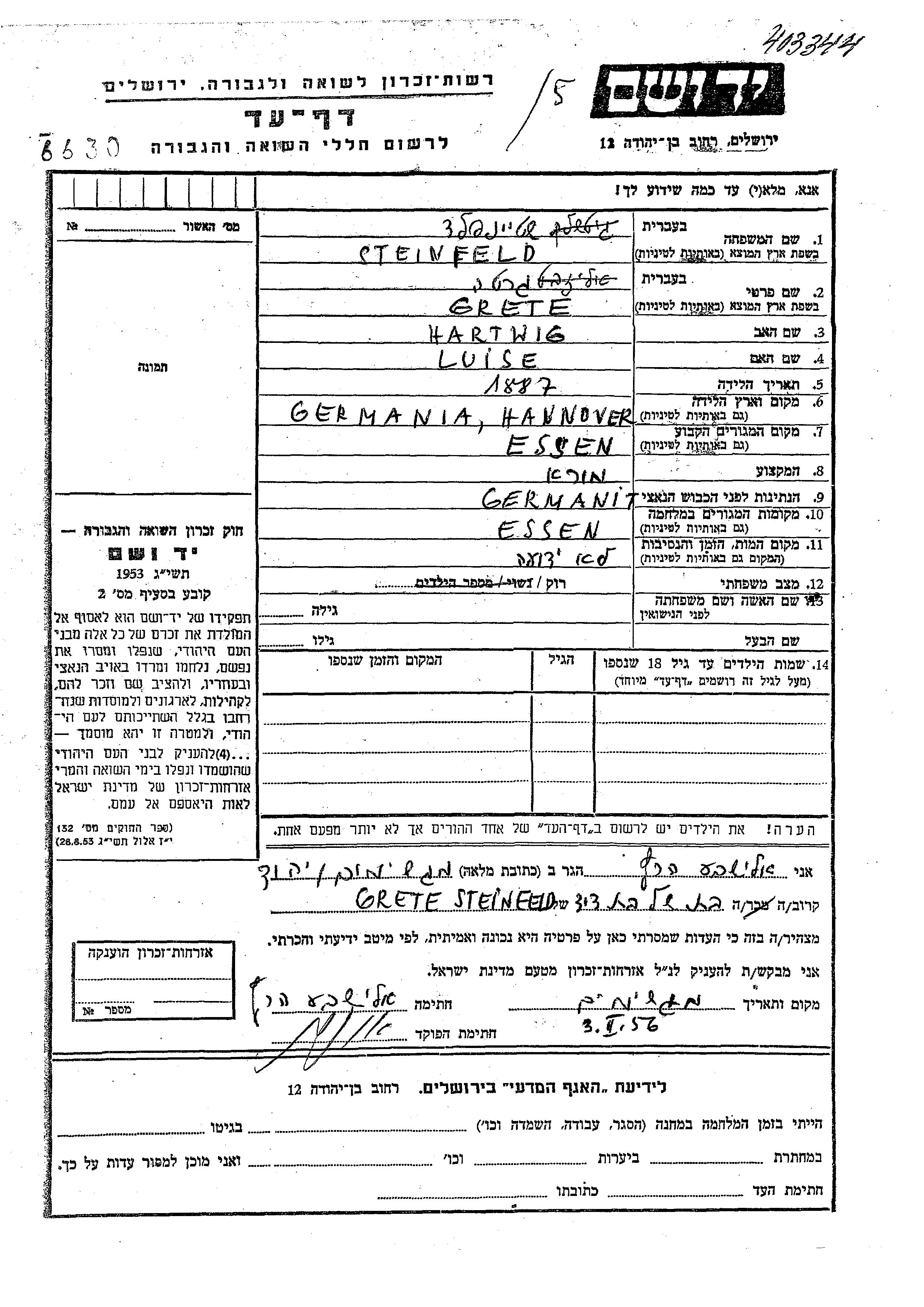 Grete אליזבט Steinfeld נולדה בHannover שבגרמניה בשנת 1887 לHartwig וLuise. היא היתה מורה ורווקה. לפני מלחמת העולם השניה התגוררה בEssen שבגרמניה. בזמן המלחמה היא היתה בEssen שבגרמניה. היא נרצחה בשואה.