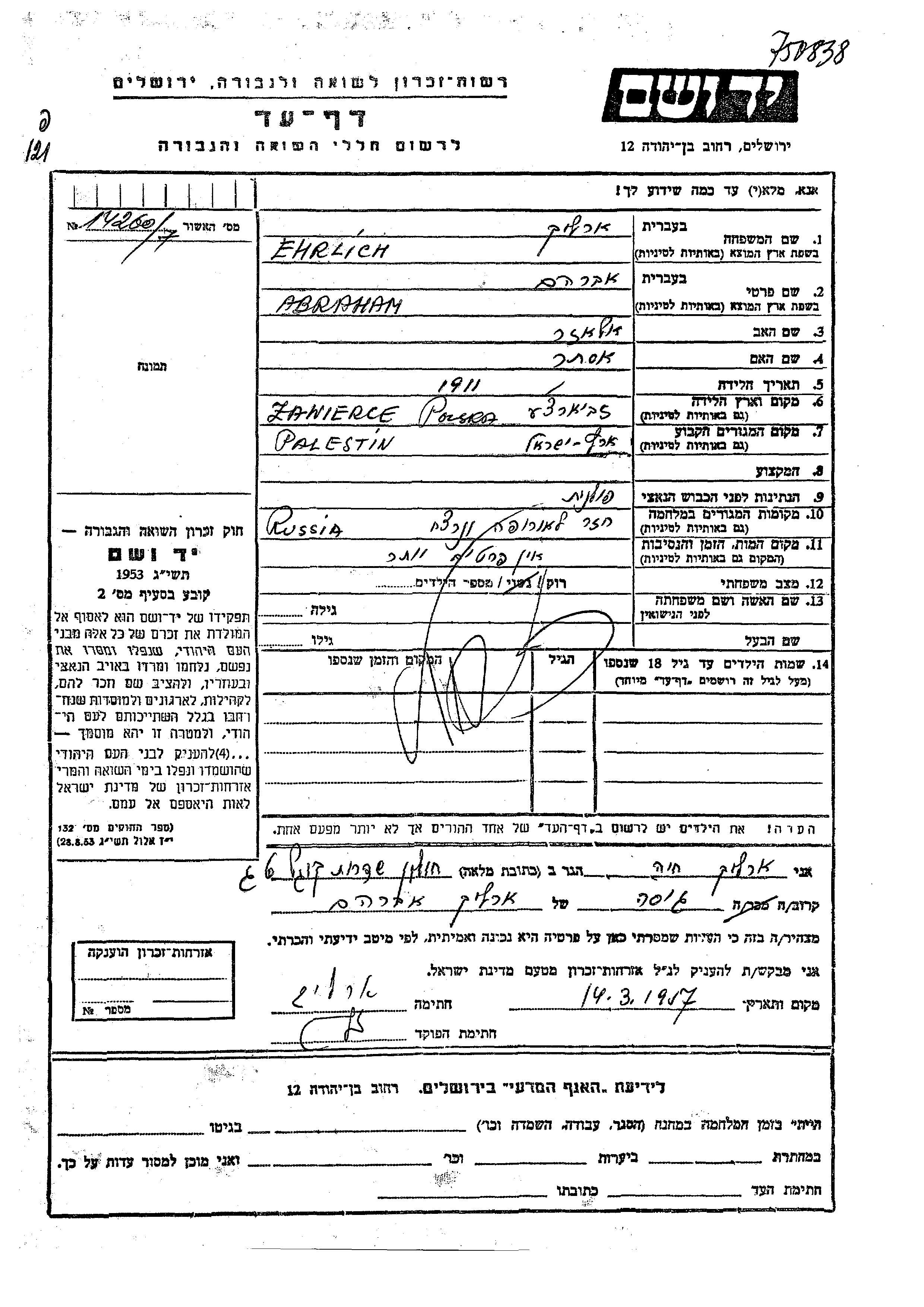 Abraham Ehrlich נולד בZawierce שבפולין בשנת 1911 לאלאזר ואסתר. הוא היה רווק. לפני מלחמת העולם השניה התגורר בארץ ישראל המנדטורית. בזמן המלחמה הוא היה ברוסיה (ברה"מ). הוא נרצח בשואה.