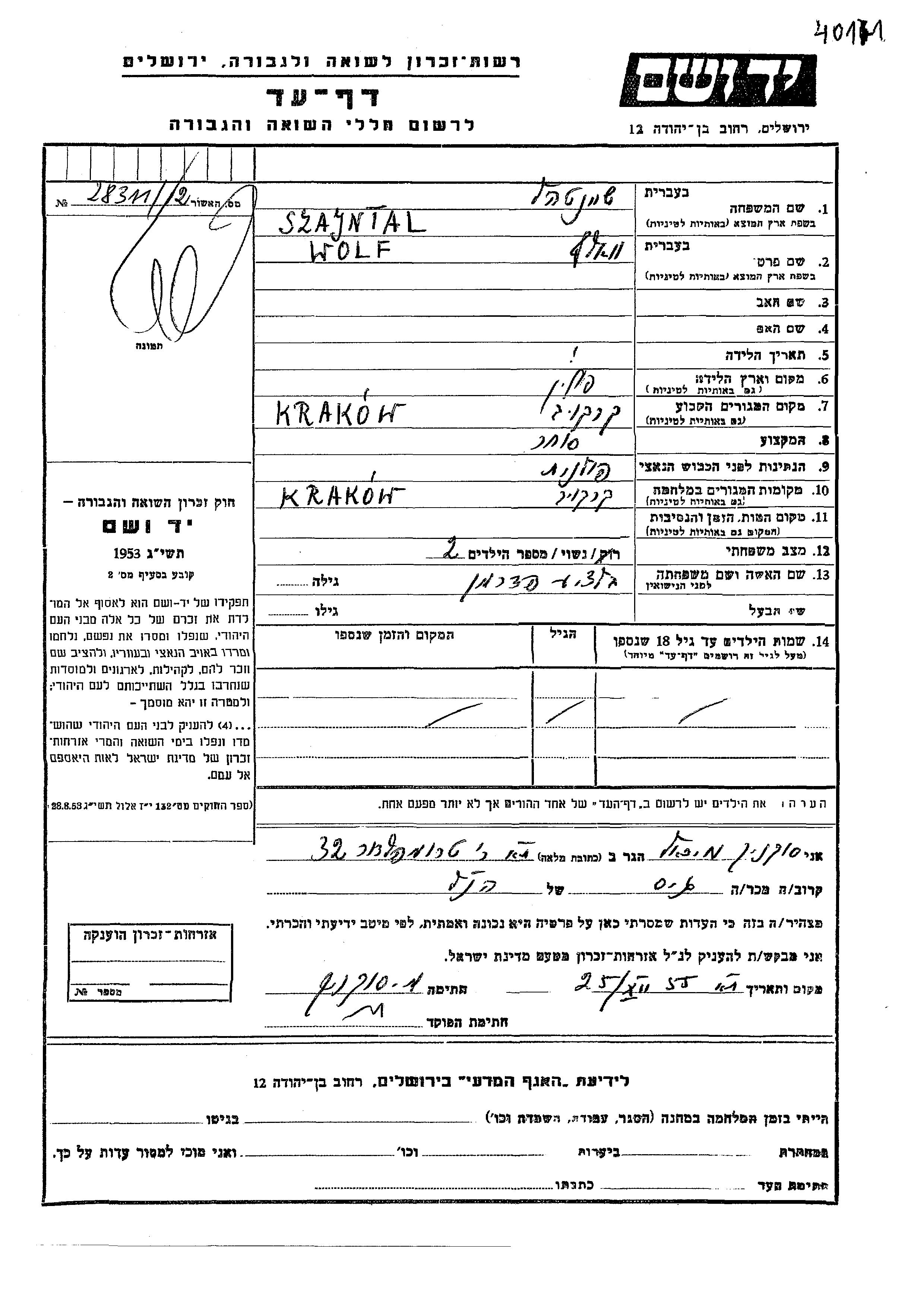 Wolf Szayntal נולד בפולין. הוא היה סוחר ונשוי לבלציע לבית פדרמן. לפני מלחמת העולם השניה התגורר בKrakow שבפולין. בזמן המלחמה הוא היה בKrakow שבפולין.