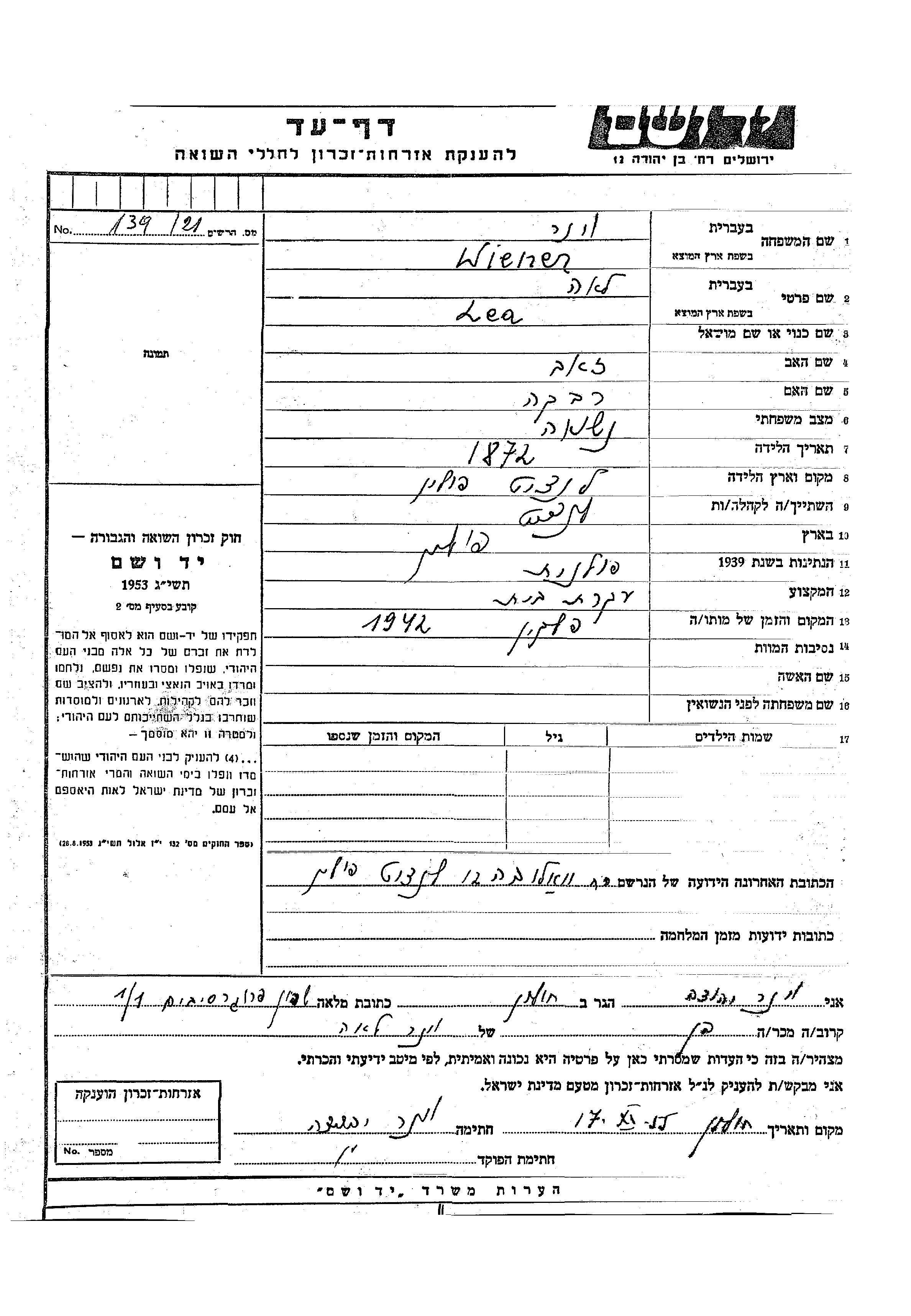 לאה Wiener נולדה בLancut שבפולין בשנת 1872 לזאב ורבקה. היא היתה עקרת בית ונשואה. לפני מלחמת העולם השניה התגוררה בLancut שבפולין. בזמן המלחמה היא היתה בLancut שבפולין. לאה נרצחה בשואה. מקום המוות: Pelkin שבפולין בשנת 1942.