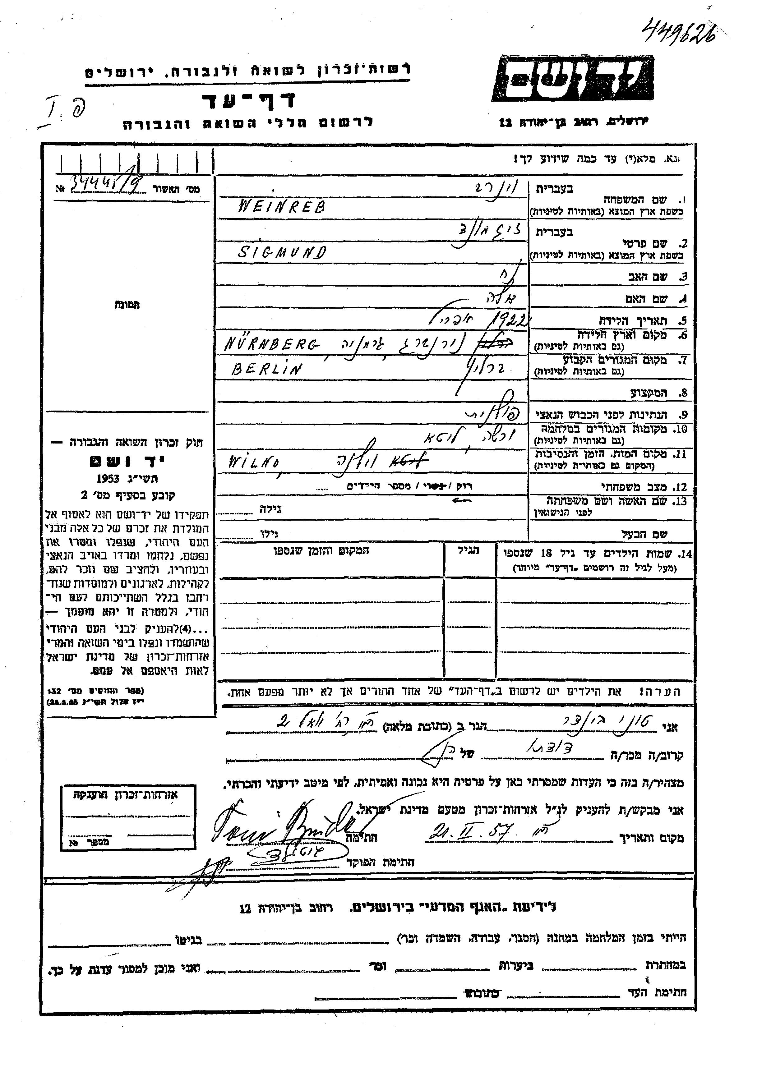 סיגמונד Weinreb נולד בNurnberg שבגרמניה בשנת 1922 לנח ואלה. הוא היה נשוי. לפני מלחמת העולם השניה התגורר בBerlin שבגרמניה. בזמן המלחמה הוא היה בWarsaw שבפולין. סיגמונד נרצח בשואה. מקום המוות: Wilno שבפולין.