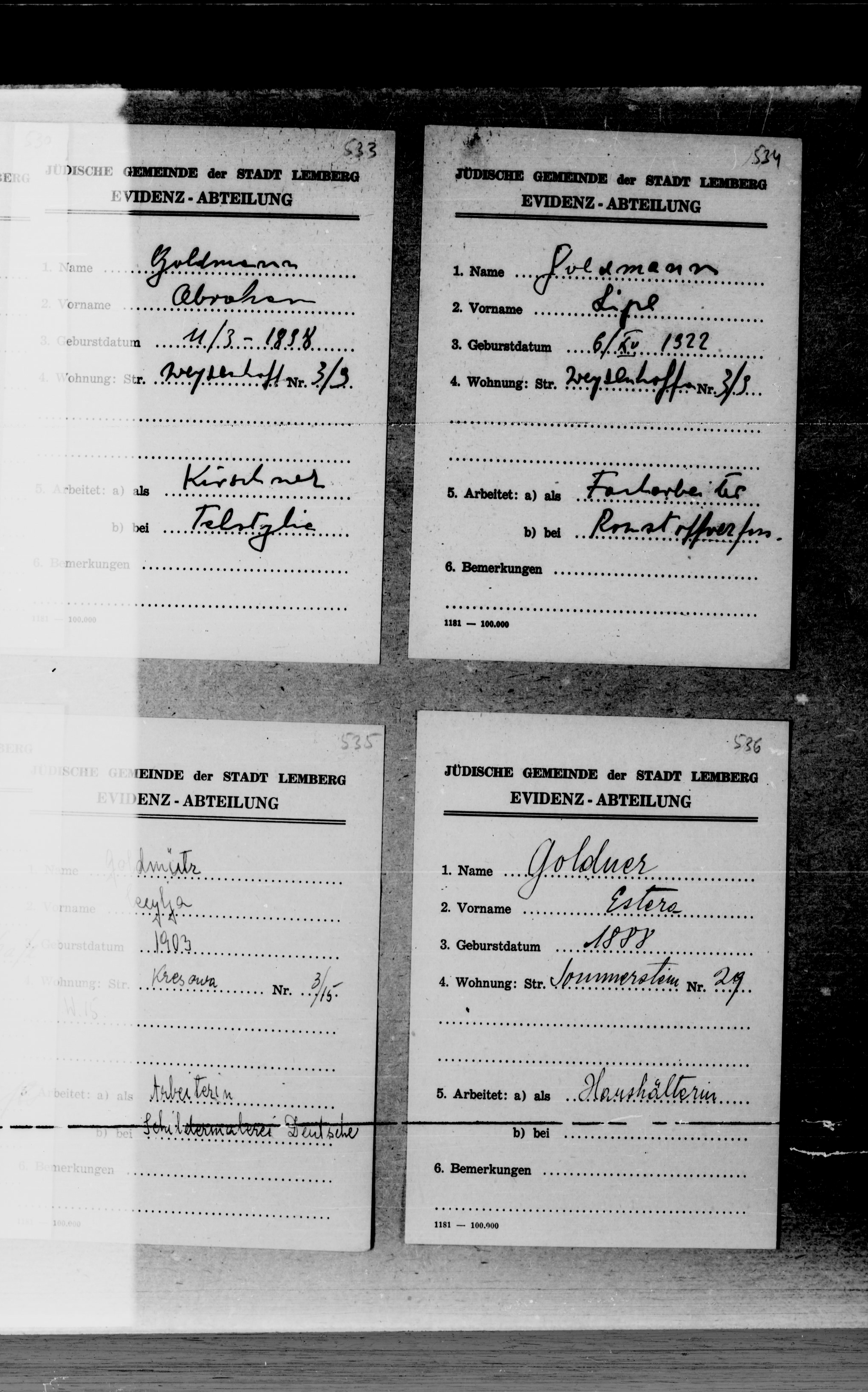 כרטסת של הקהילה היהודית בגטו Lwow ובה שמות יהודים המתחילים ב- Abend -Goldschlag, מהשנים 1943-1941