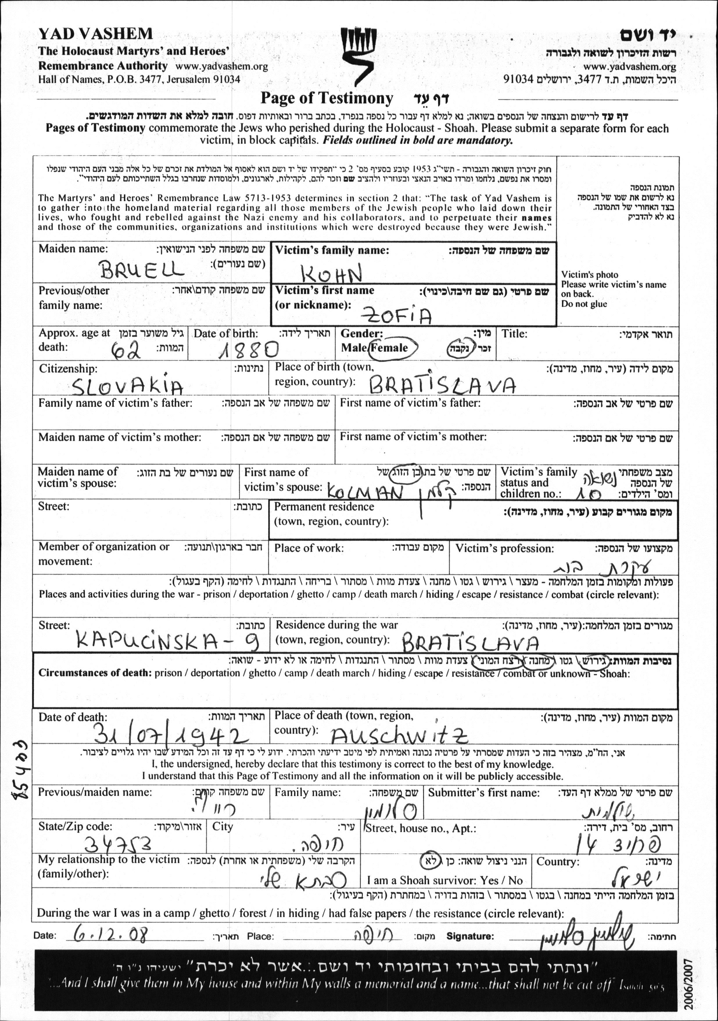 Zofia Kohn ืœื‘ื™ืช Bruell ื ื•ืœื“ื” ื‘Bratislava ืฉื‘ืฆ'ื›ื•ืกืœื•ื‘ืงื™ื” ื‘ืฉื ืช 1880. ื”ื™ื ื”ื™ืชื” ืขืงืจืช ื‘ื™ืช ื•ื ืฉื•ืื” ืœKolman. ืœืคื ื™ ืžืœื—ืžืช ื”ืขื•ืœื ื”ืฉื ื™ื” ื”ืชื’ื•ืจืจื” ื‘Bratislava ืฉื‘ืฆ'ื›ื•ืกืœื•ื‘ืงื™ื”. ื‘ื–ืžืŸ ื”ืžืœื—ืžื” ื”ื™ื ื”ื™ืชื” ื‘Bratislava ืฉื‘ืฆ'ื›ื•ืกืœื•ื‘ืงื™ื”.