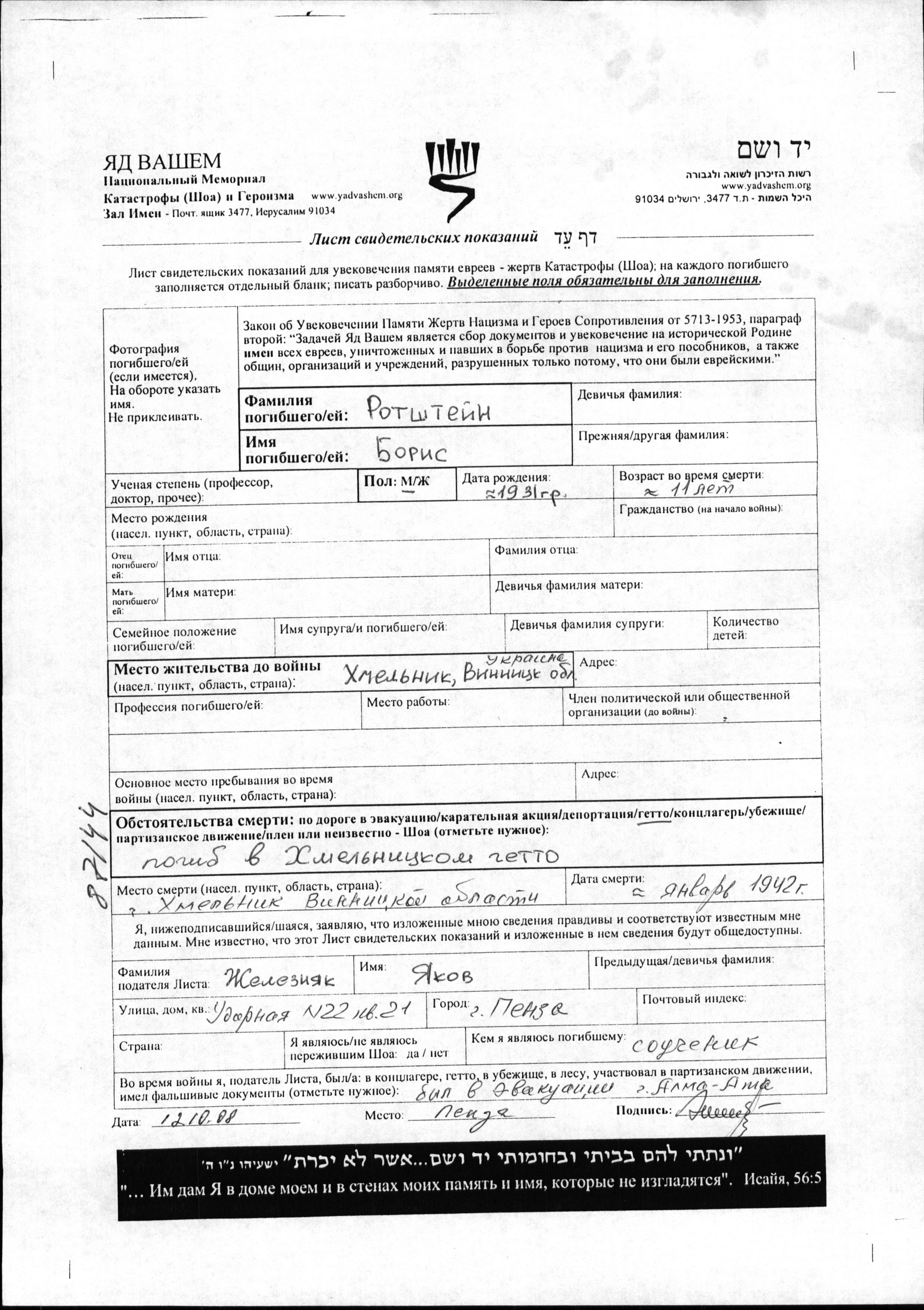 בוריס ראטשטיין נולד בשנת 1931. הוא היה ילד. לפני מלחמת העולם השניה התגורר בKhmelnik שבאוקראינה (ברה"מ). בזמן המלחמה הוא היה בKhmelnik שבאוקראינה (ברה"מ). בוריס נרצח בשואה. מקום המוות: Khmelnik שבאוקראינה (ברה"מ) בשנת 01/1942.