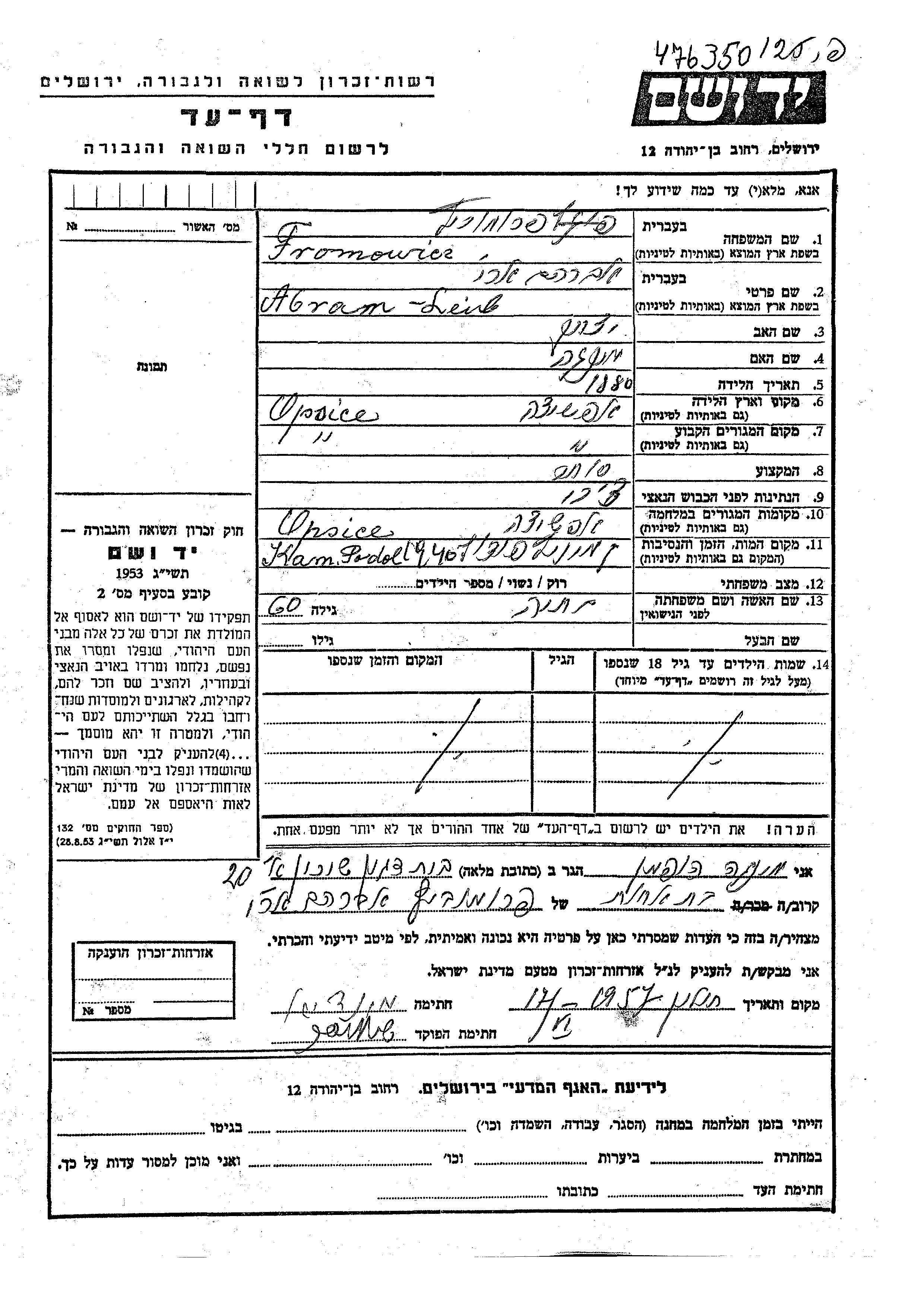 Fromowicz אברם ארי לייב 1880 Apsice, צ'כוסלובקיה דף-עד