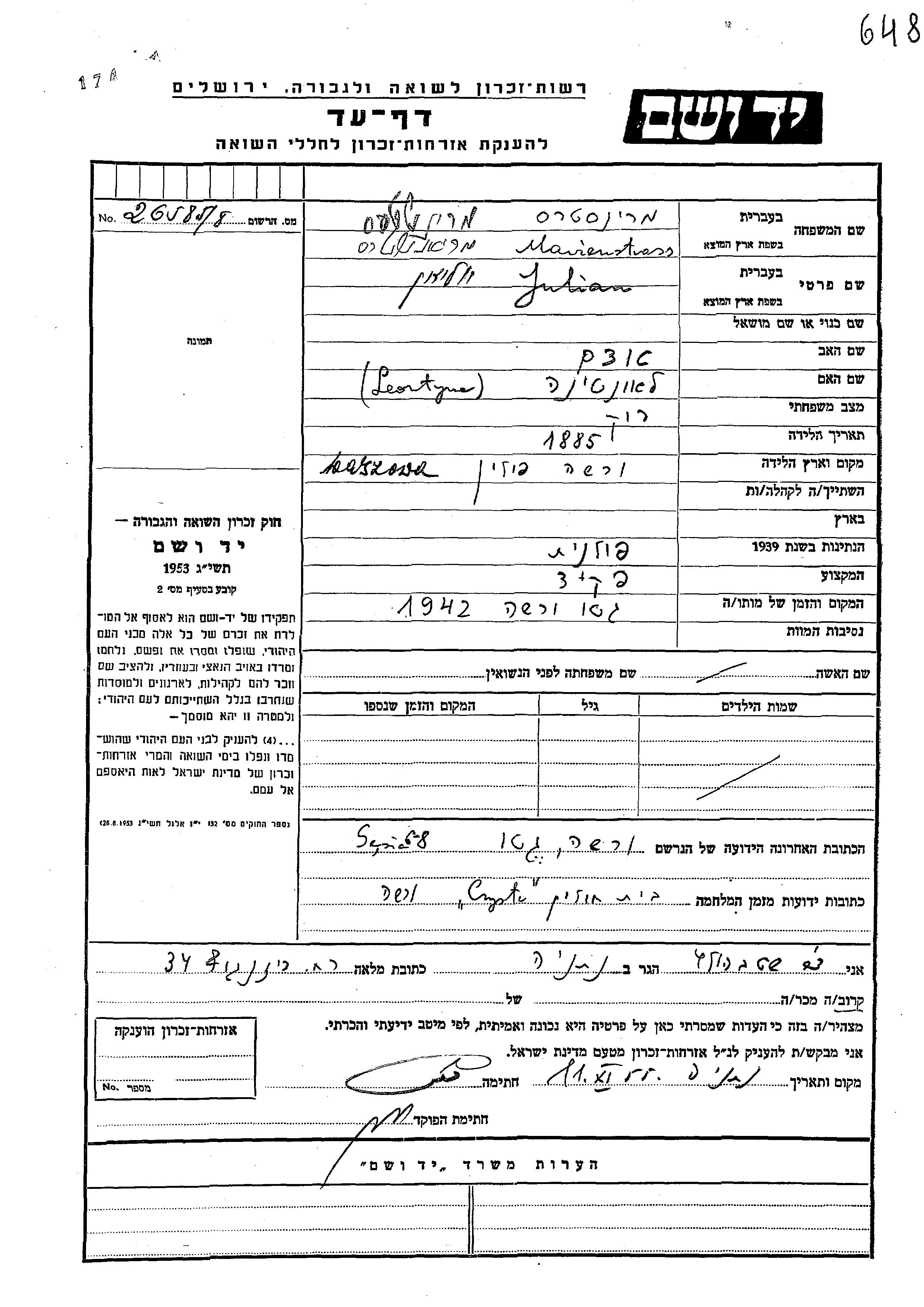 Julian Marienstress נולד בWarsaw שבפולין בשנת 1885 לאדם וLeontyna. הוא היה פקיד ורווק. בזמן המלחמה הוא היה בWarsaw שבפולין. הוא נרצח בשואה. מקום המוות: Warsaw שבפולין בשנת 1942.