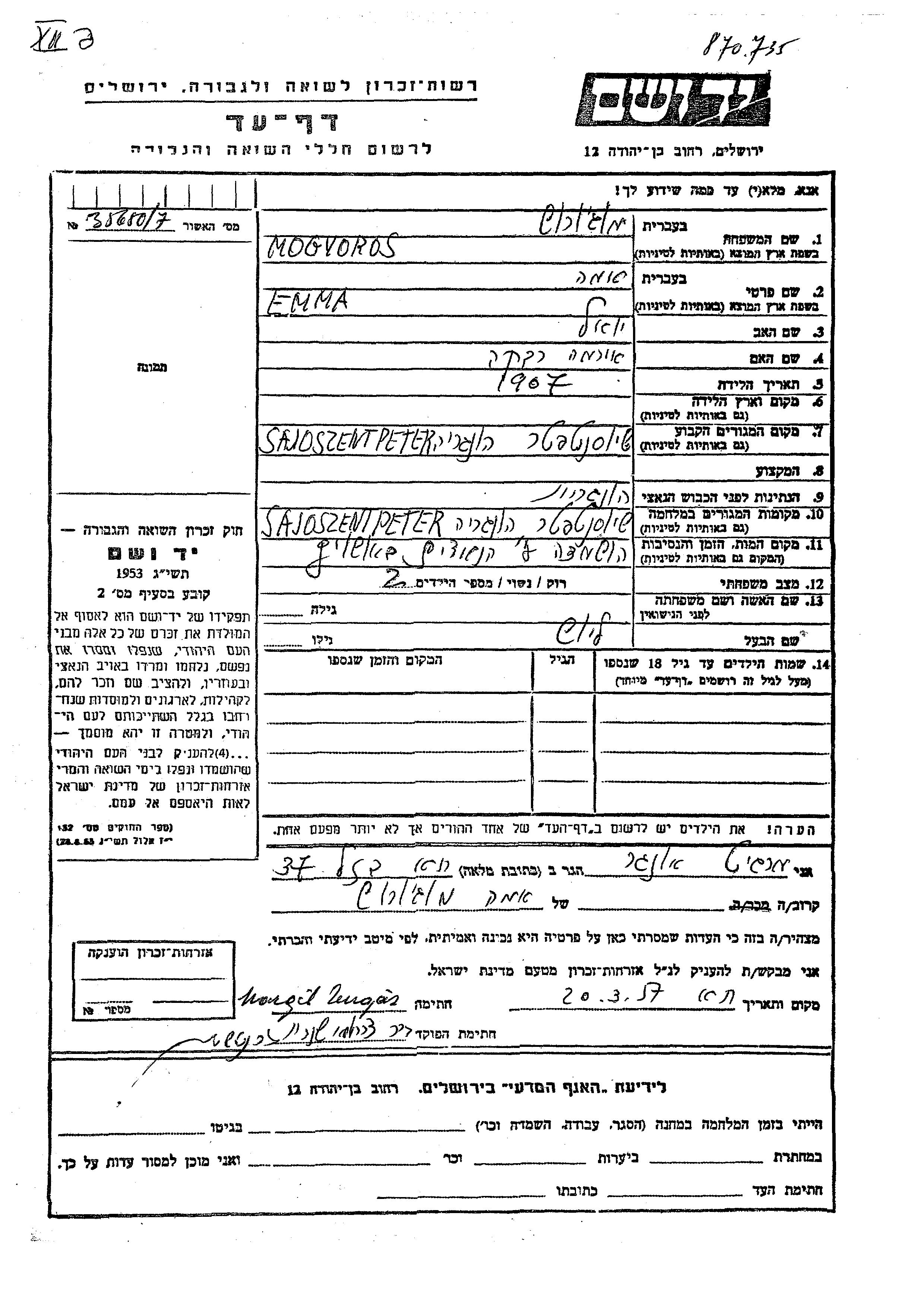 חיפוש שם מוסר דף העד. חיפוש לפי כל שם פרטי, כולל כינוי או שם חיבה