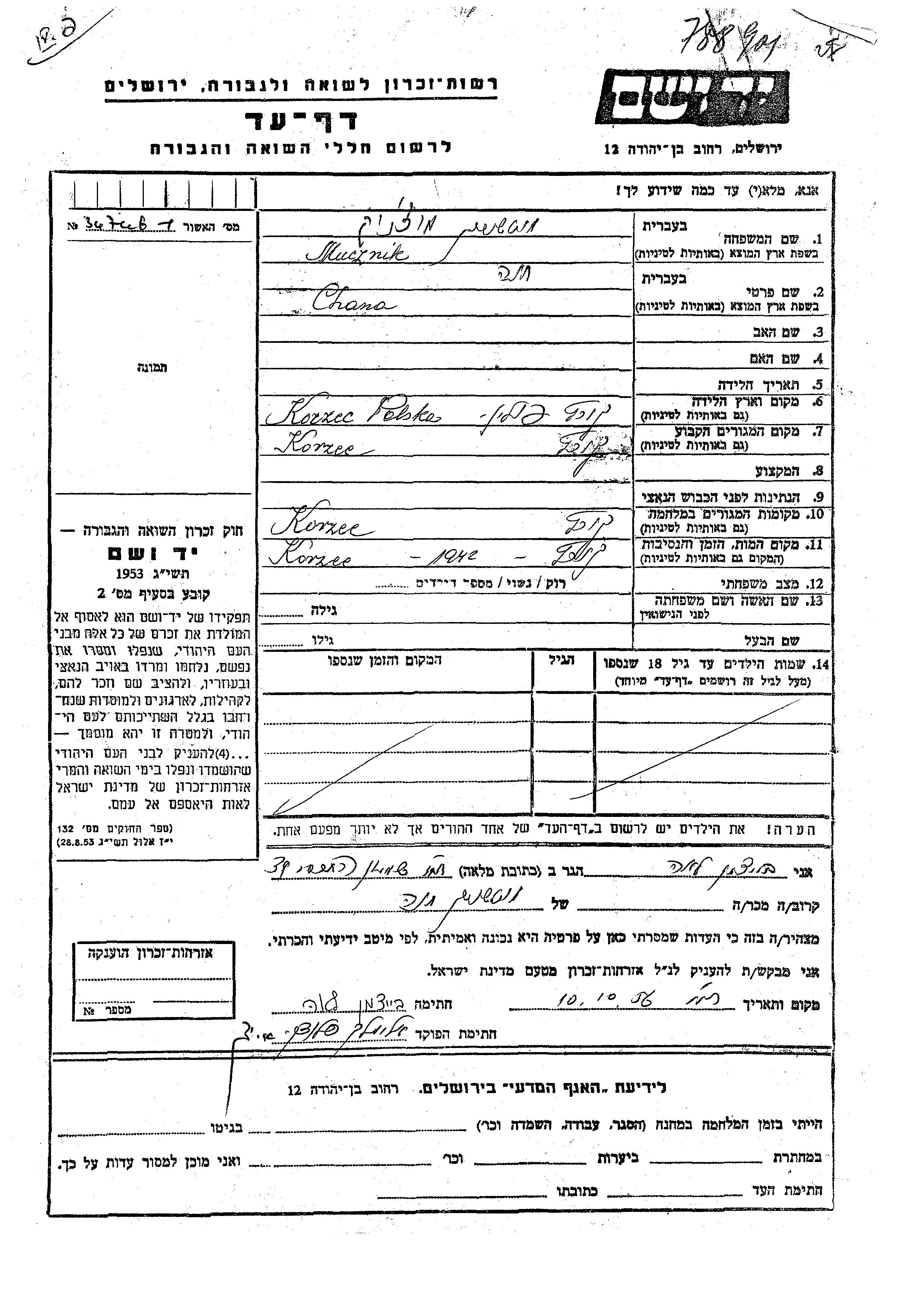 חנה Mucznik נולדה בKorzec שבפולין. לפני מלחמת העולם השניה התגוררה בKorzec שבפולין. בזמן המלחמה היא היתה בKorzec שבפולין.