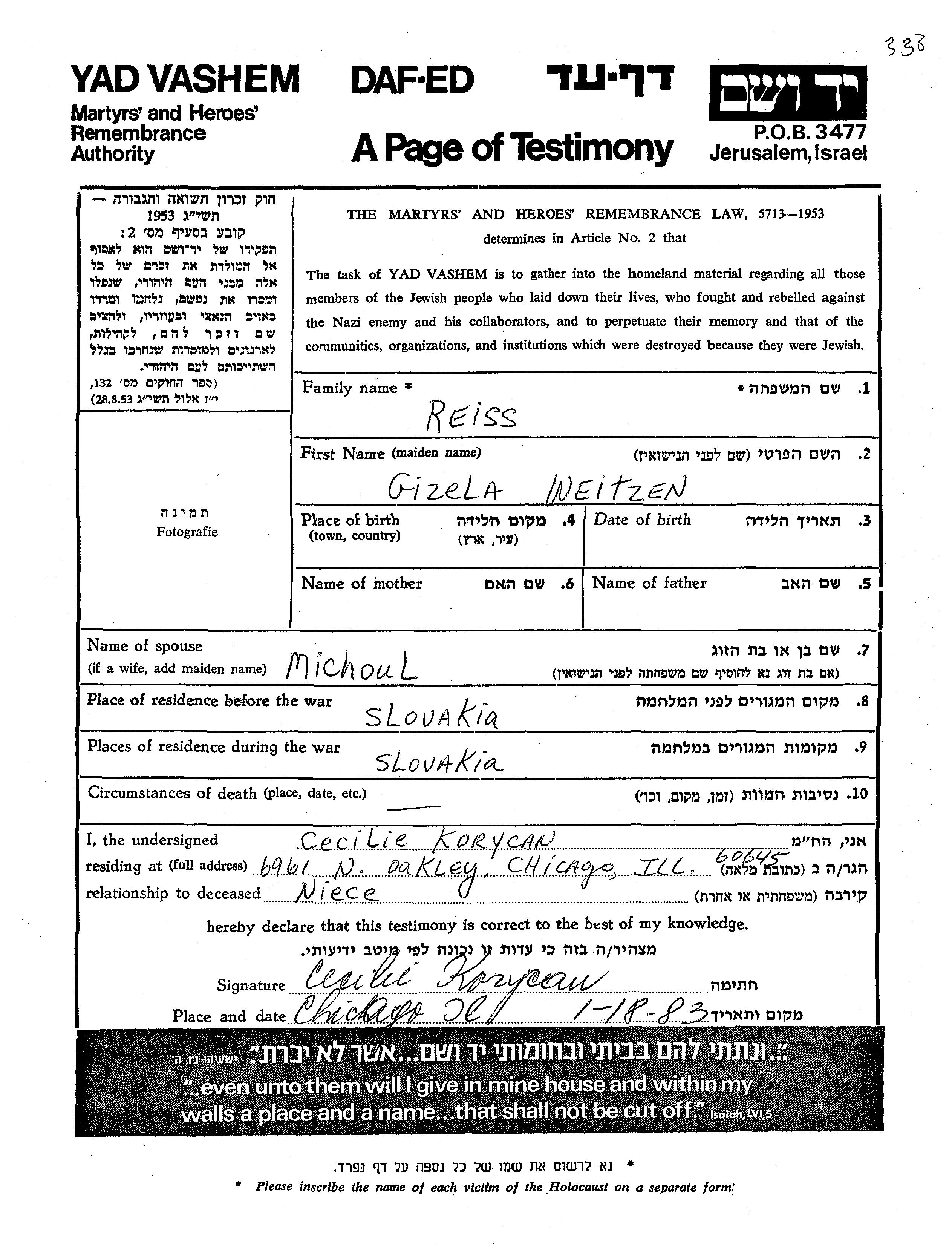 גיזלה Reiss לבית Weitzen. לפני מלחמת העולם השניה התגוררה בSlovakia שבצ'כוסלובקיה. בזמן המלחמה היא היתה בSlovakia שבצ'כוסלובקיה.