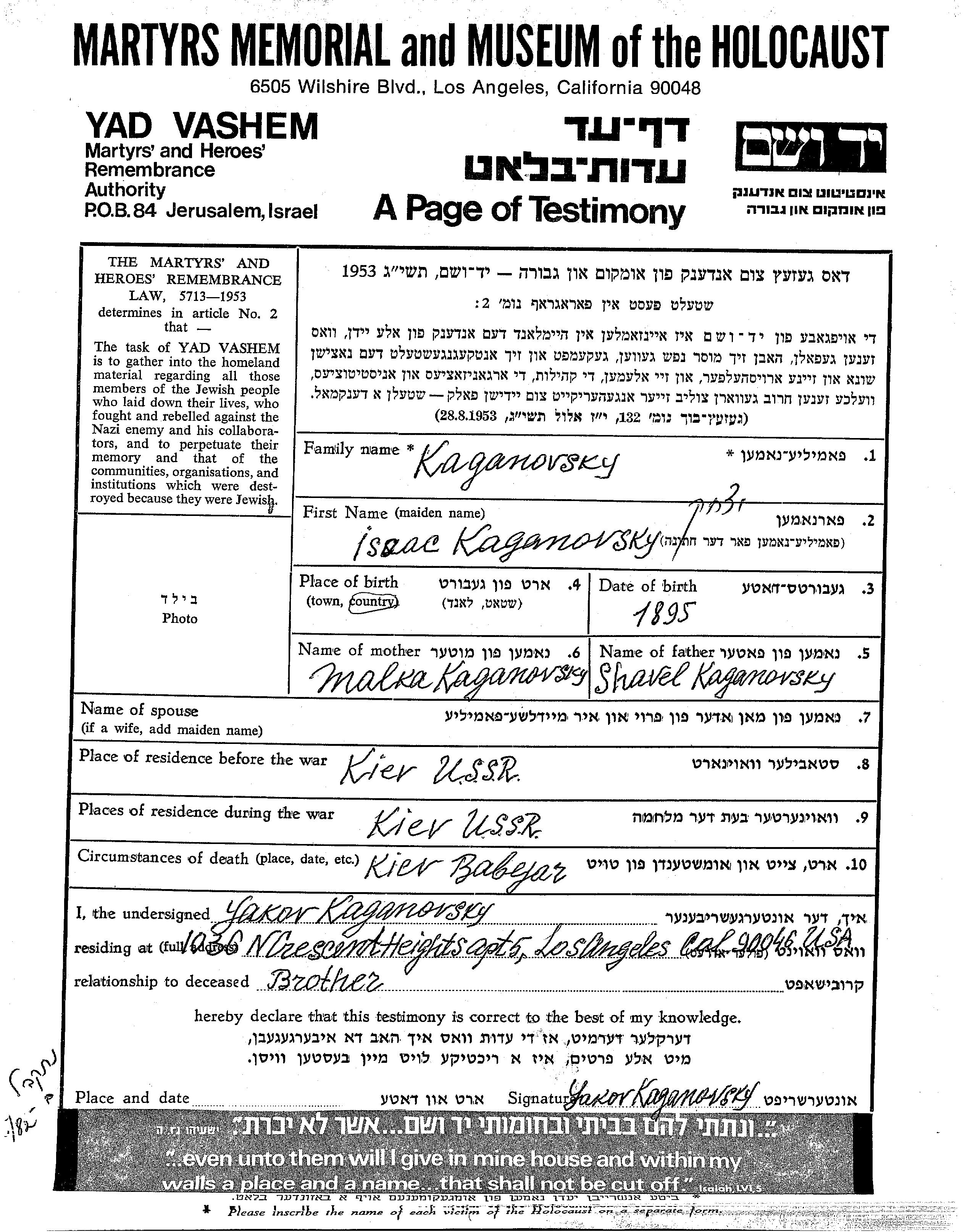 Isaac Kaganovsky נולד בשנת 1895 לShavel ומלכה. לפני מלחמת העולם השניה התגורר בKiev שבאוקראינה (ברה"מ). בזמן המלחמה הוא היה בKiev שבאוקראינה (ברה"מ). הוא נרצח בשואה. מקום המוות: Kiev שבאוקראינה (ברה"מ).