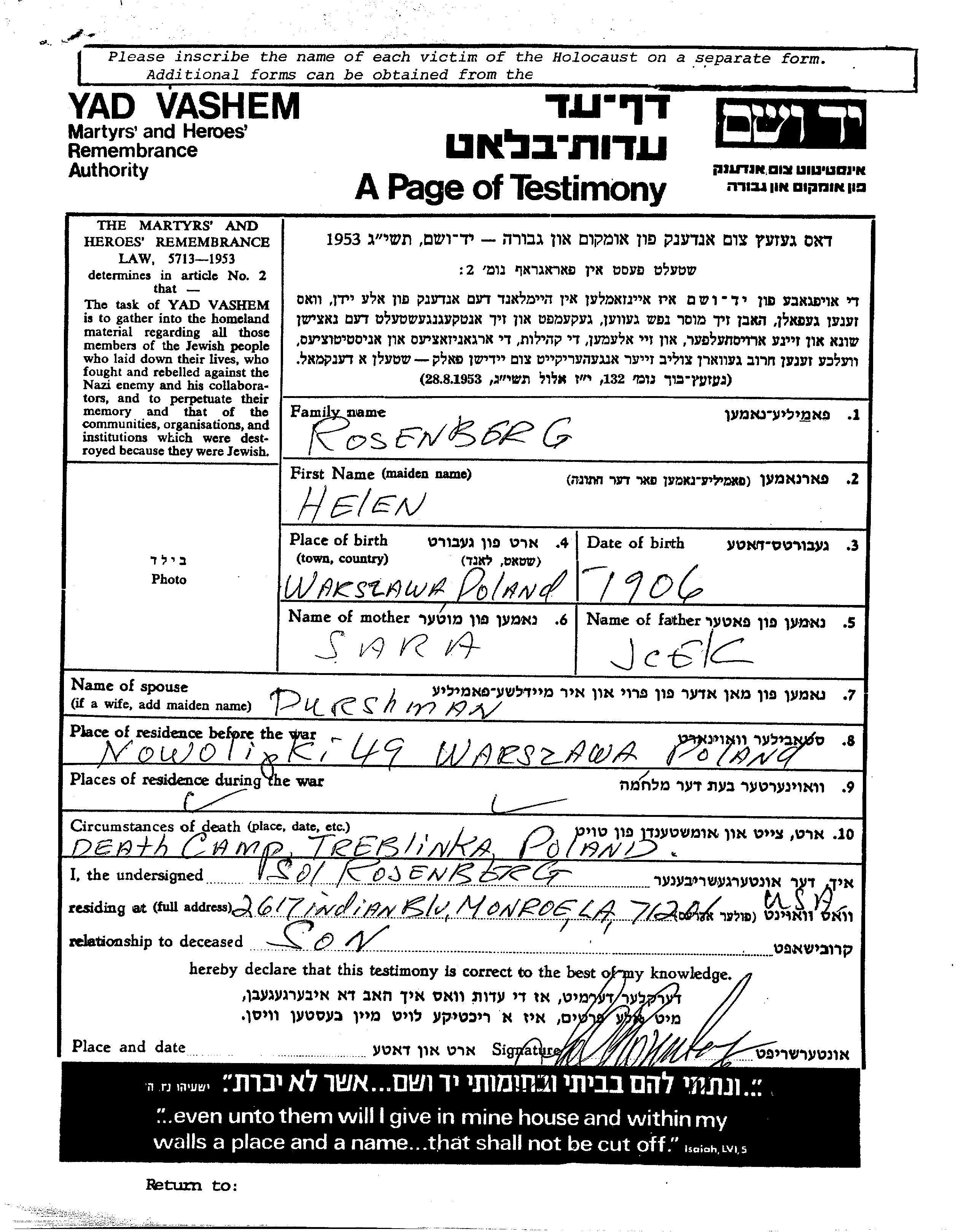הלן Rosenberg לבית Durshman נולדה בWarszawa שבפולין בשנת 1906 לJcek ושרה. היא היתה נשואה. לפני מלחמת העולם השניה התגוררה בWarszawa שבפולין. בזמן המלחמה היא היתה בWarszawa שבפולין.