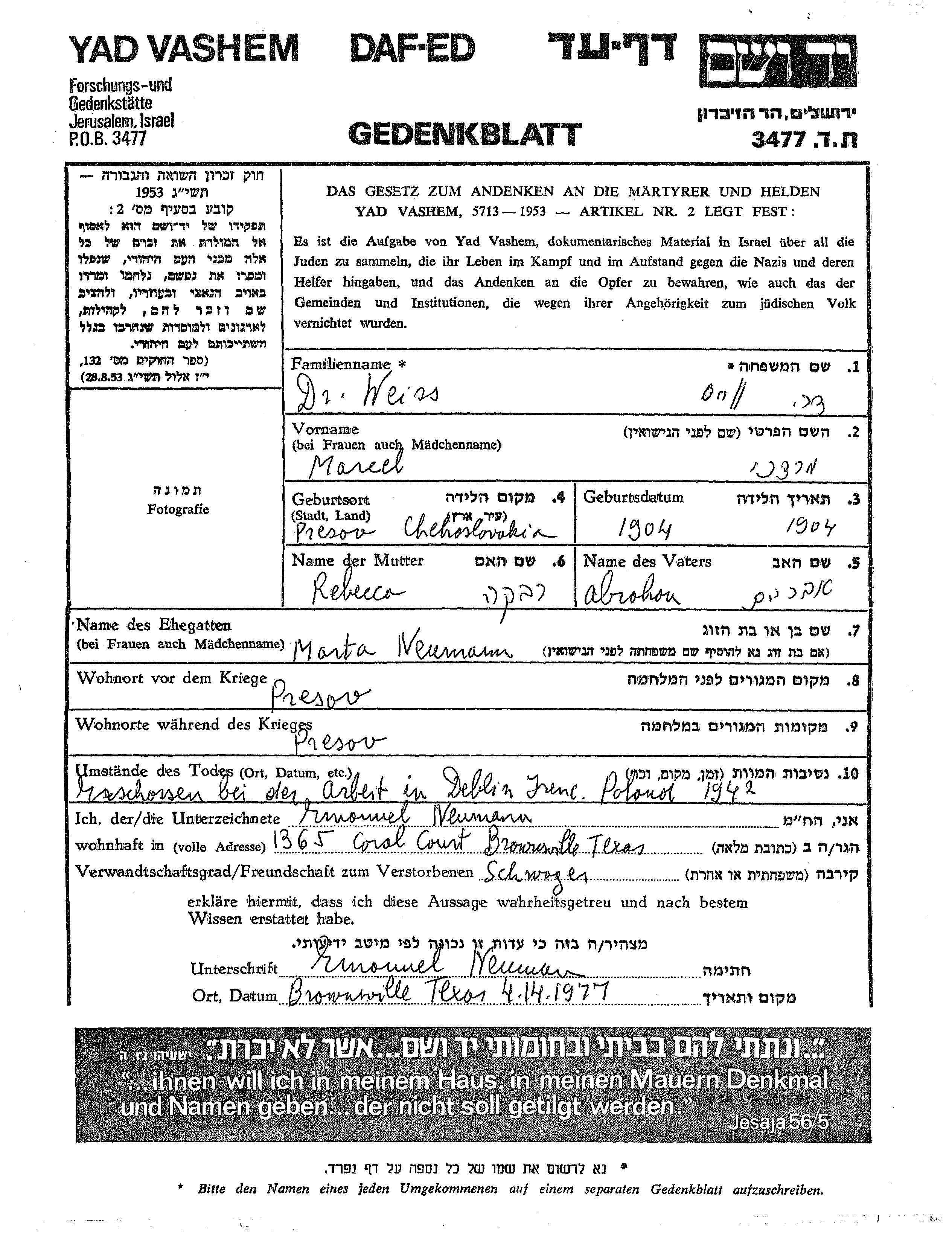 דר. Marcel מרדכי Weiss נולד בPresov שבצ'כוסלובקיה בשנת 1904 לAbraham וRebecca. הוא היה נשוי למרטה לבית Neumann. לפני מלחמת העולם השניה התגורר בPresov שבצ'כוסלובקיה. בזמן המלחמה הוא היה בPresov שבצ'כוסלובקיה.