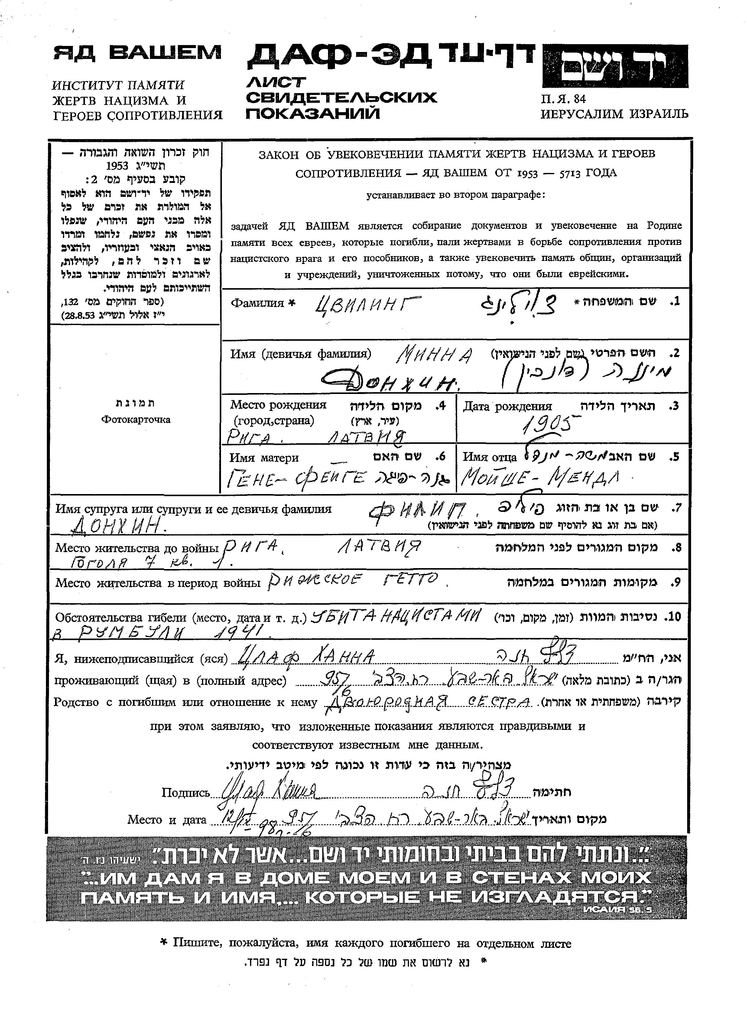 Minna צוילינג לבית דונכין נולדה בRiga שבלטביה בשנת 1905 לMoishe Mendl וGene פייגה. היא היתה נשואה לPhilip. לפני מלחמת העולם השניה התגוררה בRiga שבלטביה. בזמן המלחמה היא היתה בRiga שבלטביה. היא נרצחה בשואה. מקום המוות: Rumbuli שבלטביה בשנת 1941.