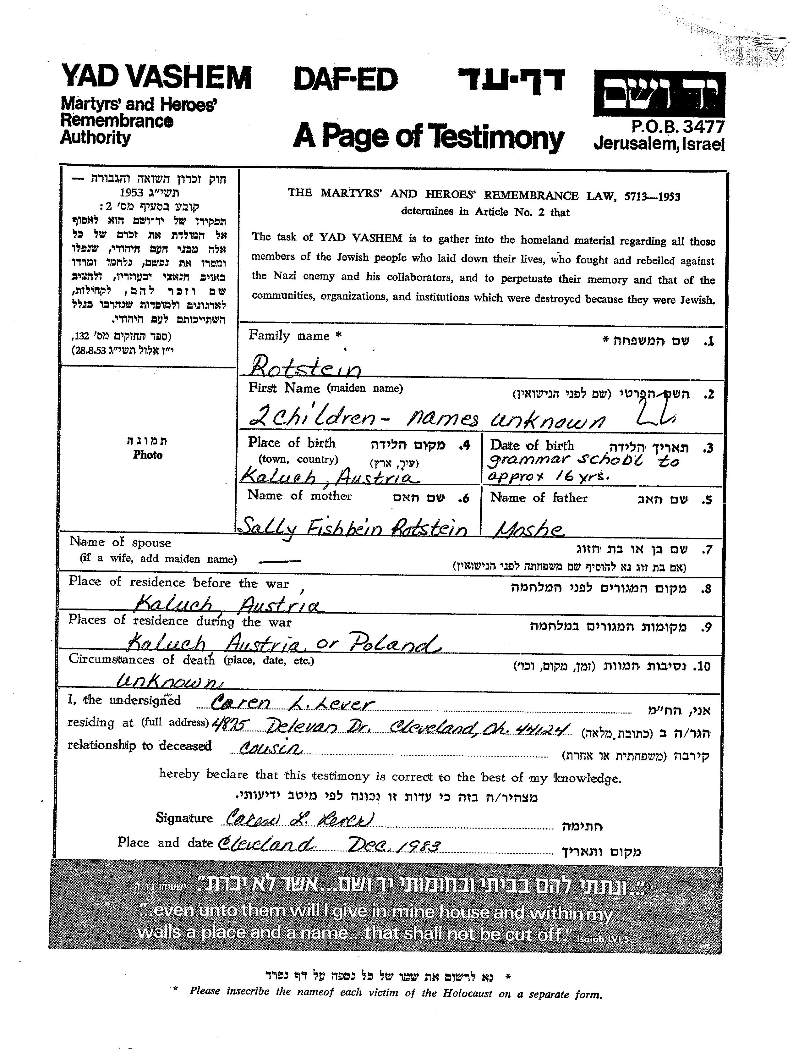שם פרטי לא ידוע Rotstein נולד/ה בKalush שבפולין למשה וSally. הוא/היא היה/היתה ילד/ילדה. לפני מלחמת העולם השניה התגורר/התגוררה בKalush שבפולין. בזמן המלחמה הוא/היא היה/היתה בKalush שבפולין.