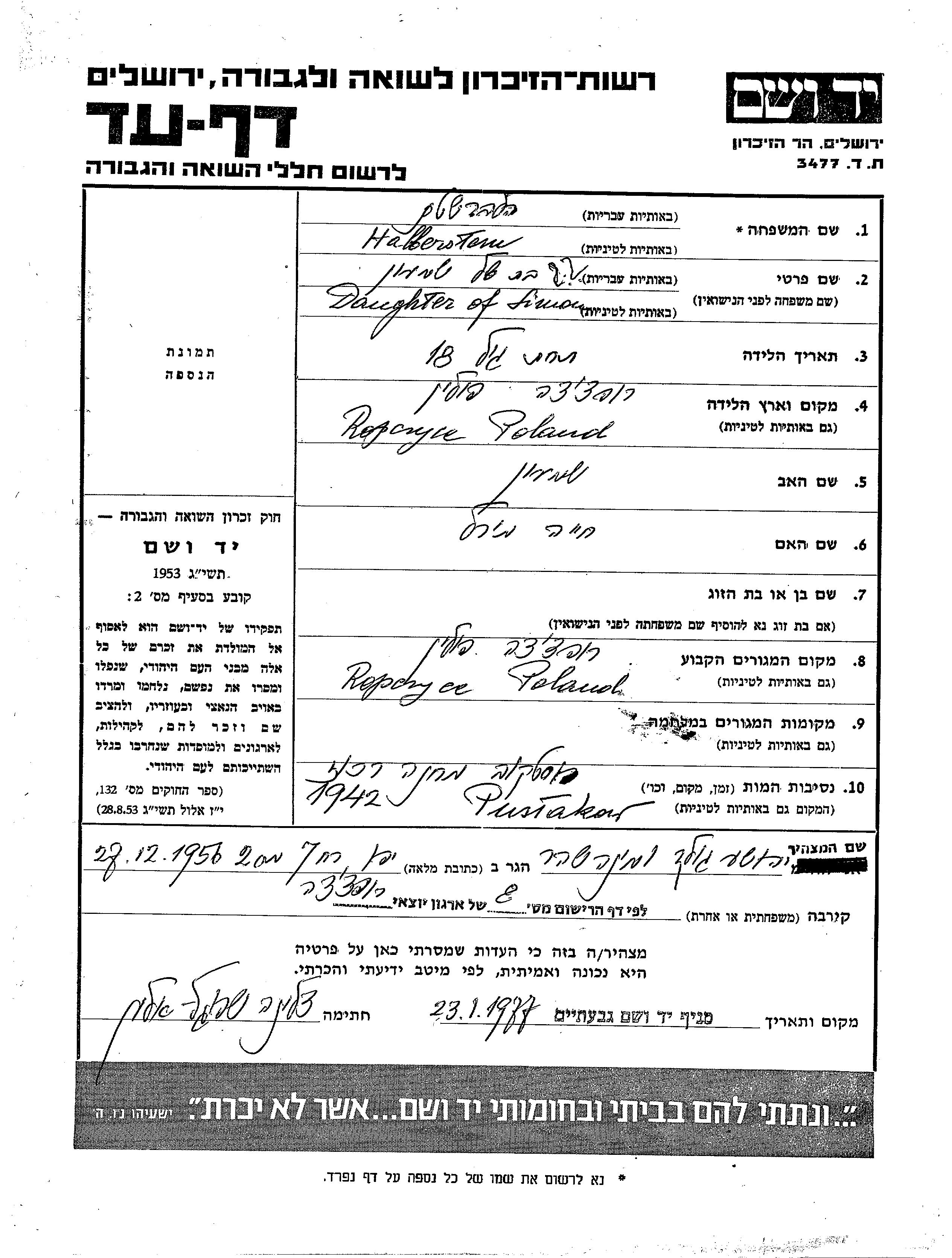 שם פרטי לא ידוע Halberstam נולדה בRopczyce שבפולין לסימון וחייה מירל. היא היתה ילדה. לפני מלחמת העולם השניה התגוררה בRopczyce שבפולין. היא נרצחה בשואה. מקום המוות: Pustakow שבפולין בשנת 1942.