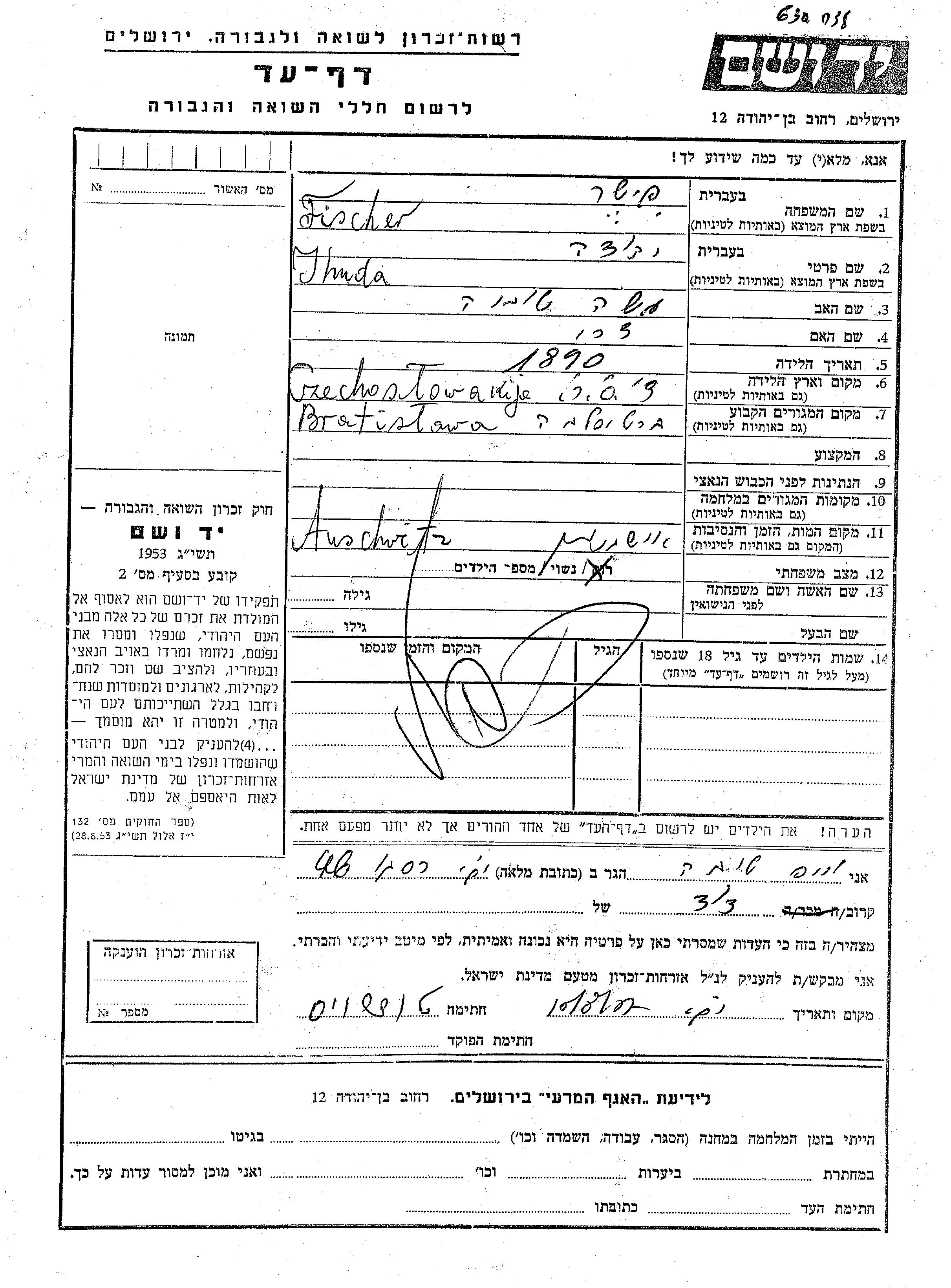 Jhuda Fischer נולד בצ'כוסלובקיה בשנת 1890 למשה טוביה וצרי. הוא היה נשוי. לפני מלחמת העולם השניה התגורר בBratislava שבצ'כוסלובקיה. הוא נרצח בשואה. מקום המוות: Auschwitz שבפולין.