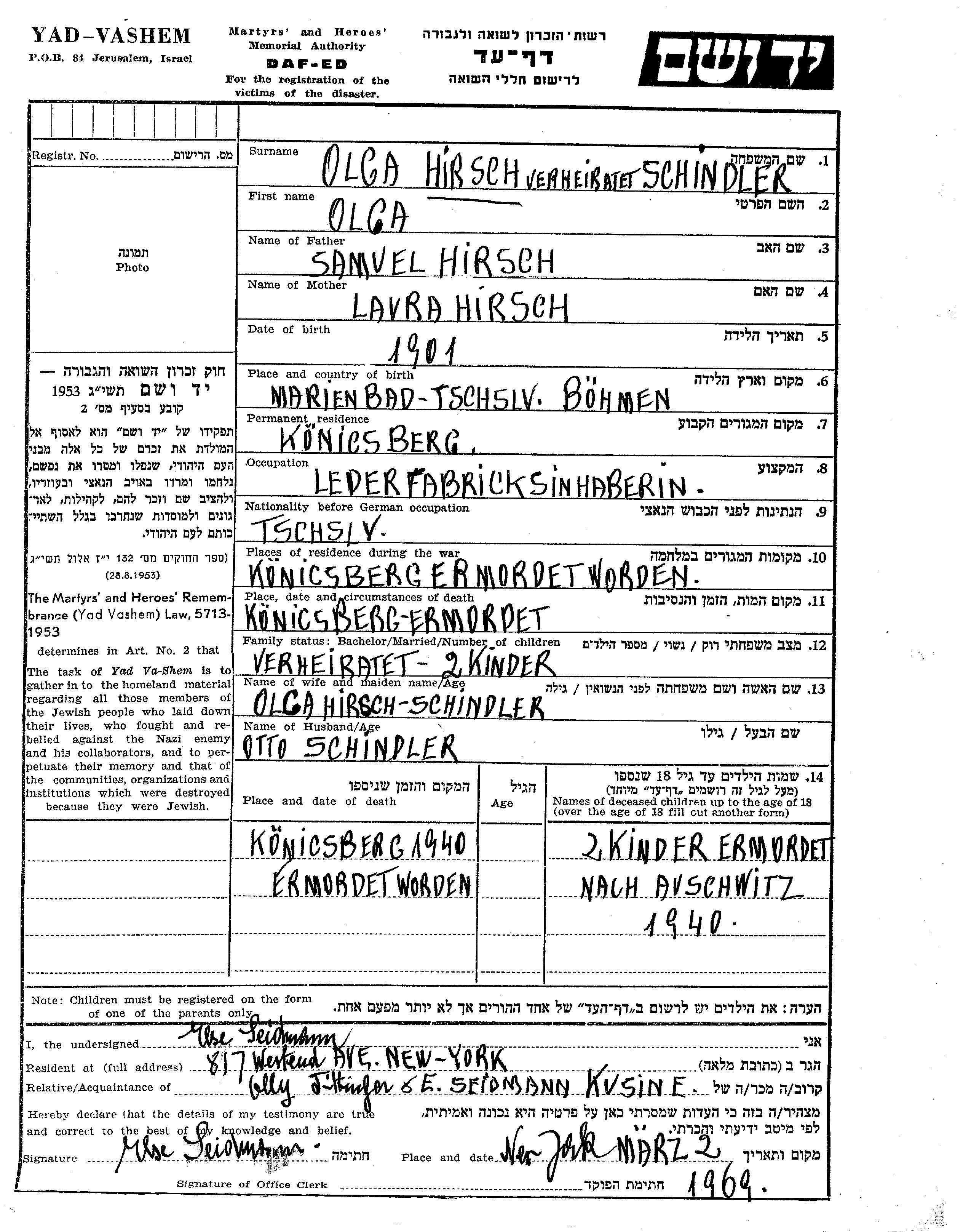 אולגה Schindler לבית Hirsch נולדה בMarienbad שבצ'כוסלובקיה בשנת 1901 לסמואל ולאורה. היא היתה Lederfabrikant ונשואה לאוטו. לפני מלחמת העולם השניה התגוררה בKoenigsberg שבצ'כוסלובקיה. בזמן המלחמה היא היתה בKoenigsberg שבצ'כוסלובקיה. אולגה נרצחה בשואה. מקום המוות: Koenigsberg שבצ'כוסלובקיה.