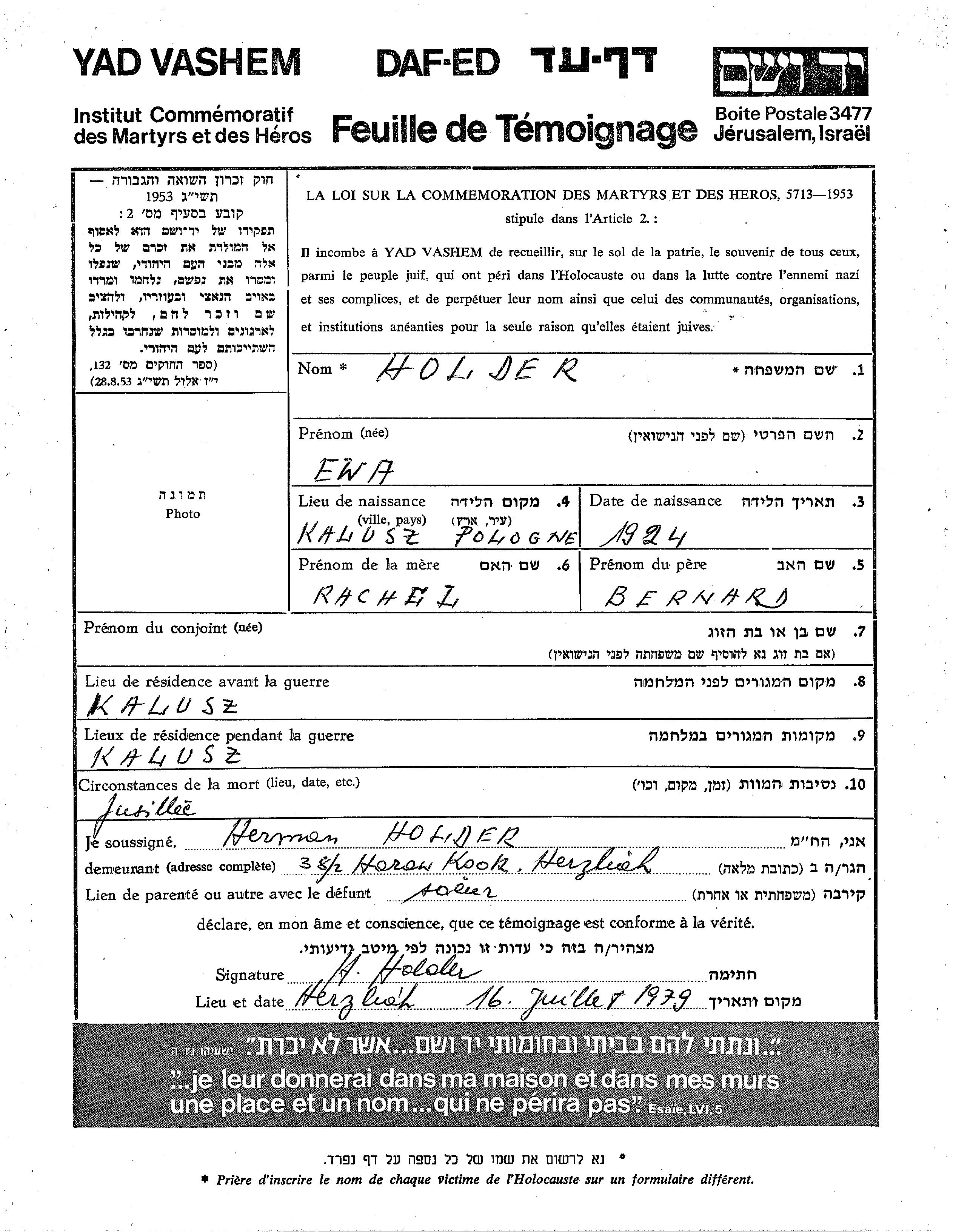 Ewa הולדר נולדה בKalusz שבפולין בשנת 1924 לברנרד ורחל. לפני מלחמת העולם השניה התגוררה בKalusz שבפולין. בזמן המלחמה היא היתה בKalusz שבפולין.